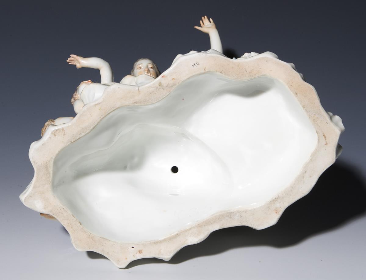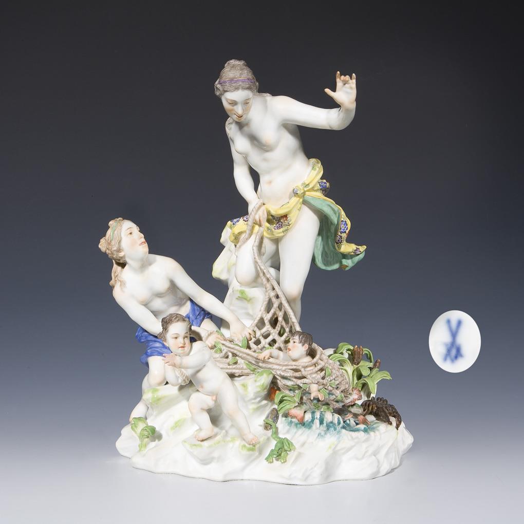 Model by Johann Joachim Kaendler 1769. colorfully painted. Incised mark, press mark, sword mark on base. Finger on three hands, a fish head, lobster, reed restored, one leaf bumped.