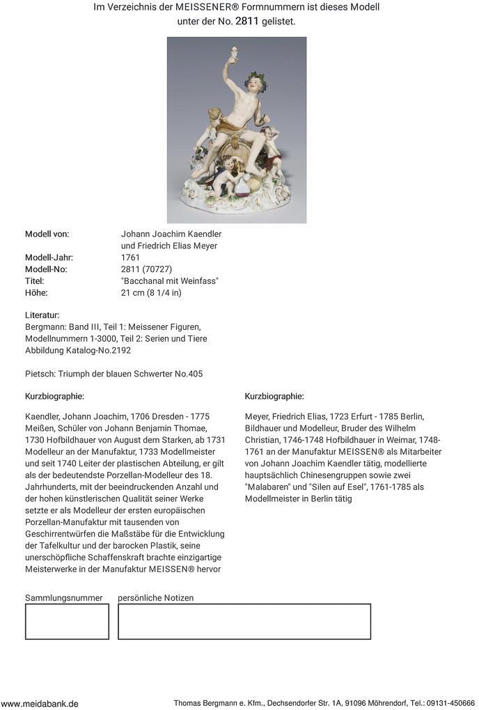 Kaendler, court sculptor and modeller. Since 1731 at the manufactory. From 1749 head of the sculptural department. Meyer, 1746-1748 court sculptor in Weimar, from 1748 modeller in Meissen, 1761-1785 model master in Berlin * Partner auction Bergmann.