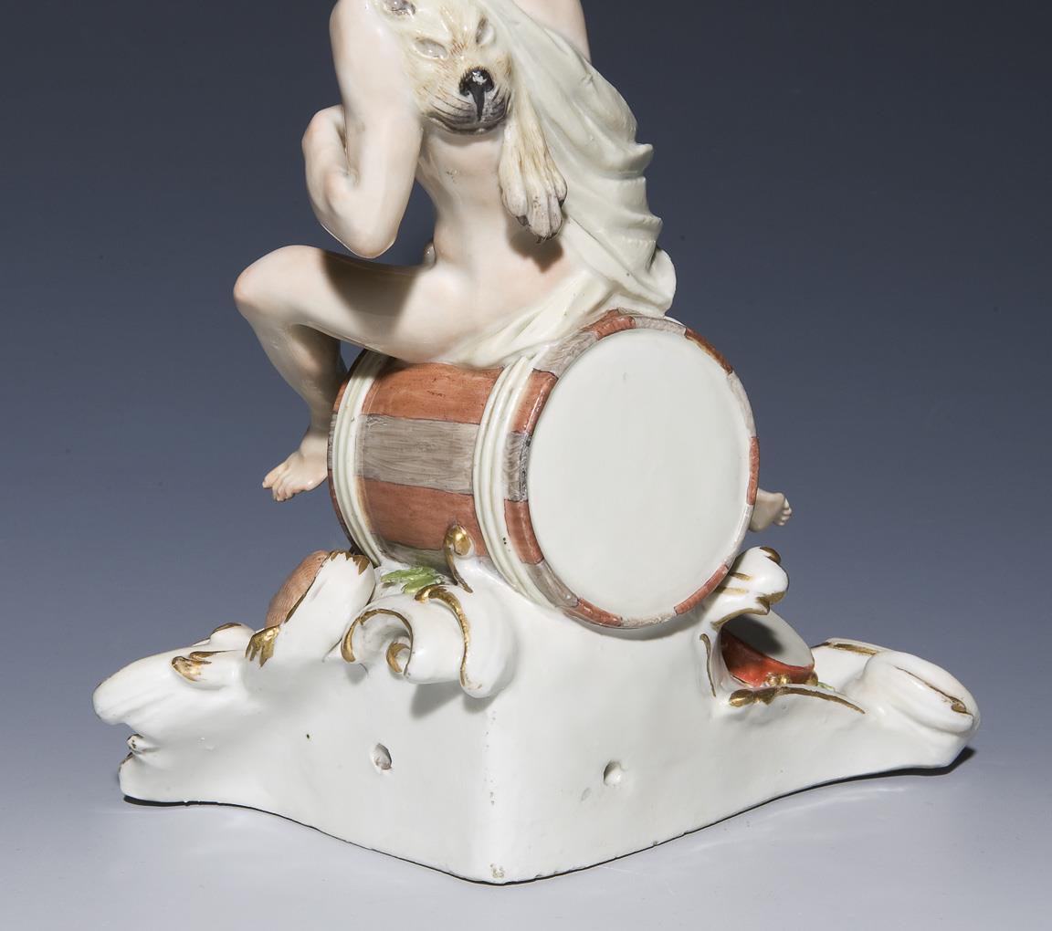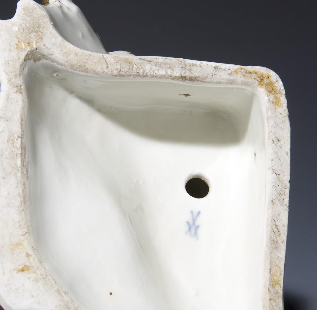 Model by Johann Joachim Kaendler and Friedrich Elias Meyer 1754. colored, painted, gold staffiert. Sword mark. Base back, a foot, some leaves restored, some leaves, a thumb bumped, frontal a base rocaille visibly restored old.