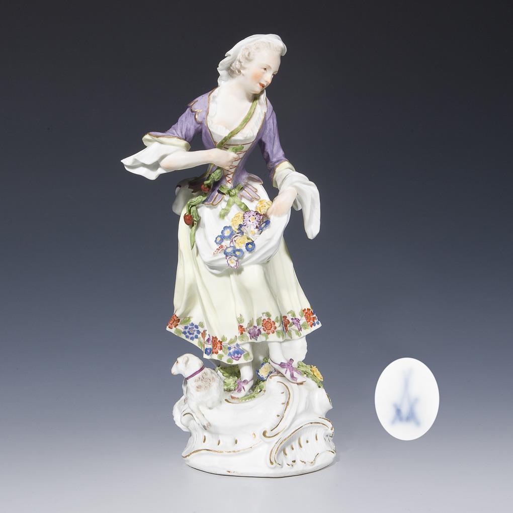 Model by Johann Joachim Kaendler 1750. From a series of ten figures. Painted in colors, gold painted. Sword mark. Leaves bumped, two leaves, branch partial, two ruffled corners, two lamb legs restored.