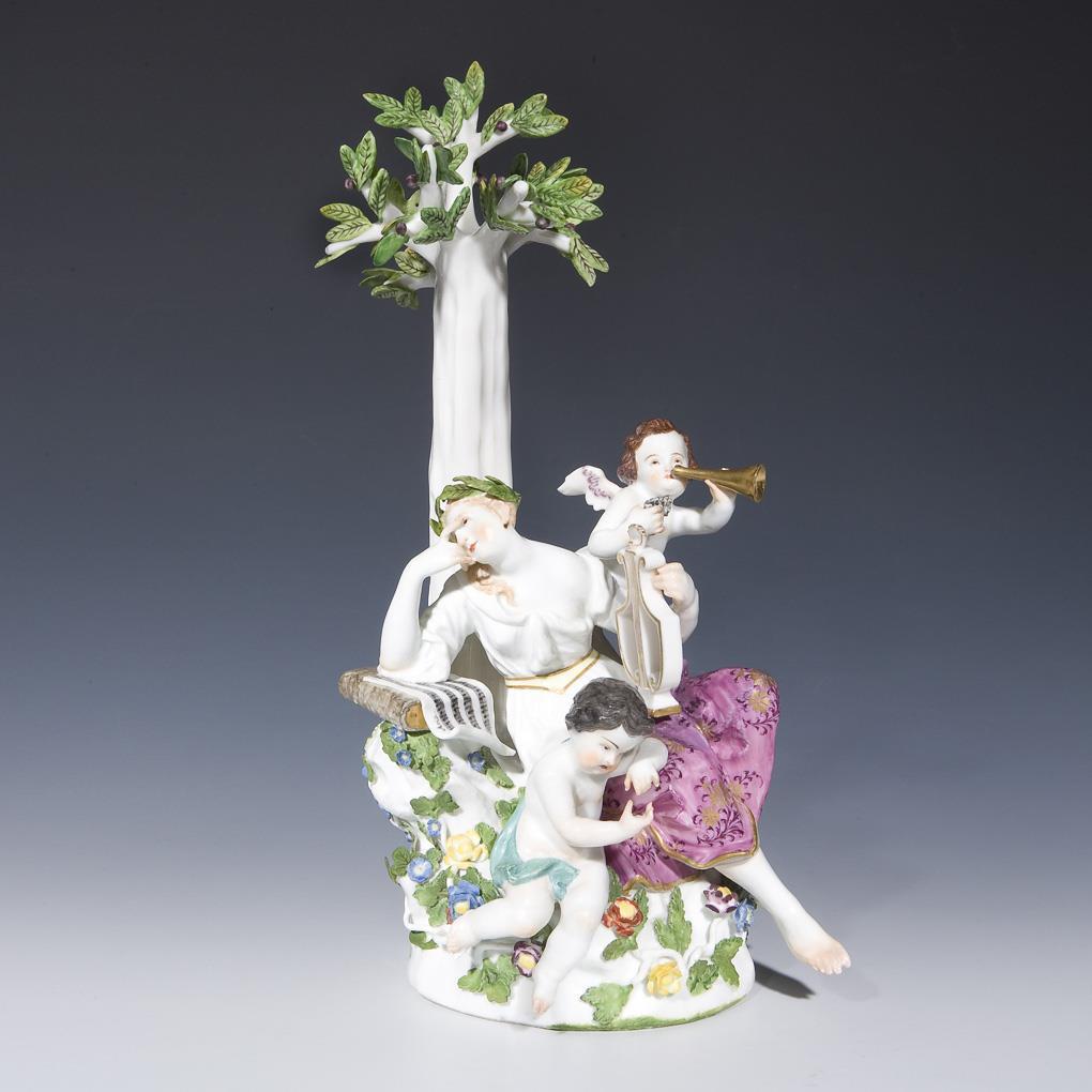 Kaendler: "Groupgen, imagining poetry, in the form of a woman sitting in speculative thought, holding in one hand the harp of Apollo, together with a child gene, so blowing a trombone..." * Partner auction miner.