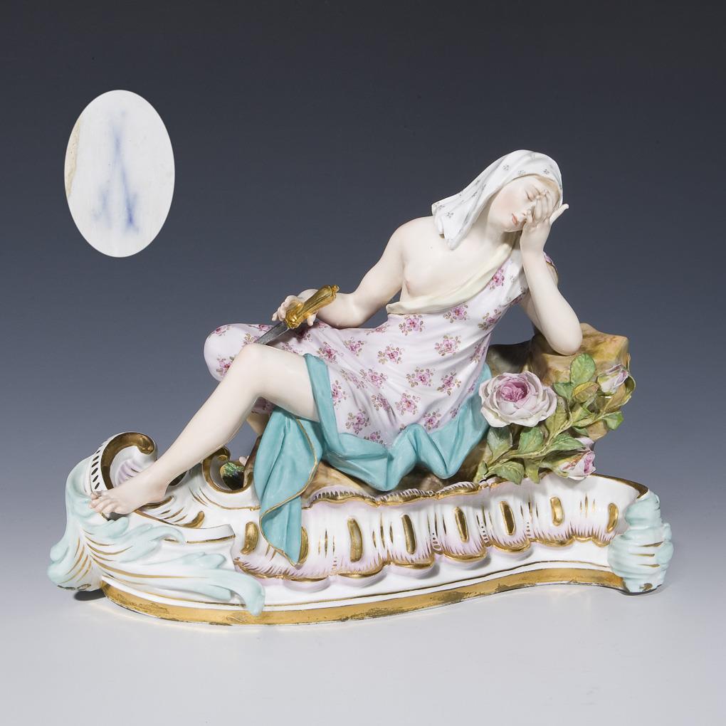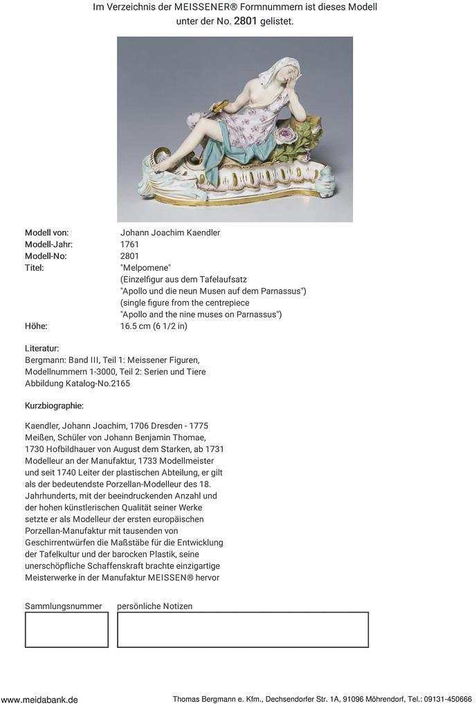 Model by Johann Joachim Kaendler 1761. single figure from the centerpiece "Apollo and the new Muses on Parnassus". Painted in colors, painted in gold. Unglazed base, incised mark, pressed mark, sword mark. Some flowers, leaves, one finger bumped, fire crack in base bottom.