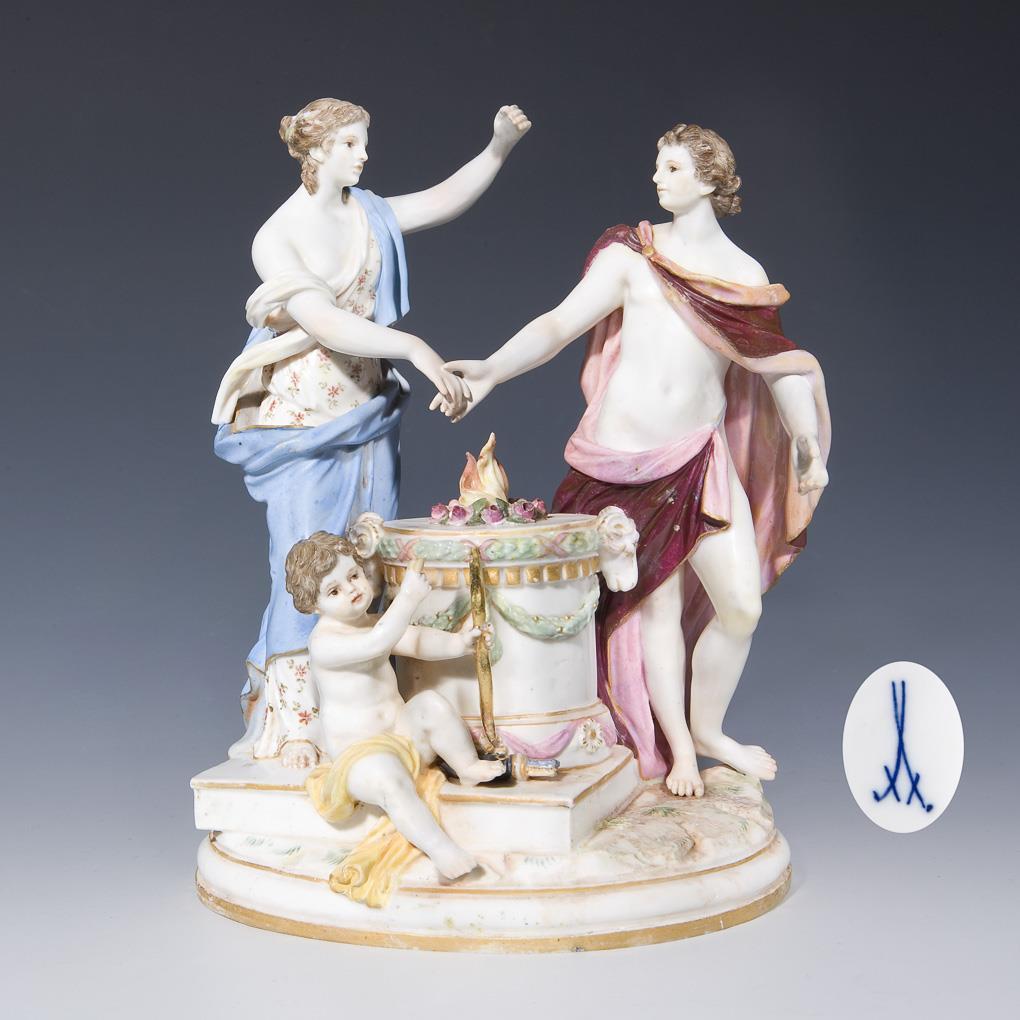 Model by Johann Joachim Kaendler and associates 1772-1774. Colored painted, gold painted. Incised mark, press mark, painter's mark, sword mark. One hand, one foot, one leg, five arms, bow restored, capes partially restored, flower in hair bumped.