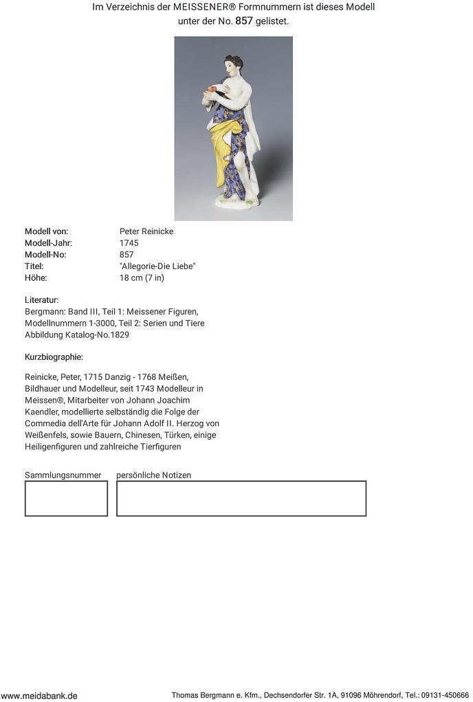 Reinicke, sculptor, since 1743 modeller in Meissen. Created numerous figures and animal figures. Collaborator of Johann Joachim Kaendler * partner auction Bergmann.