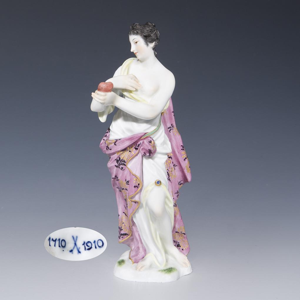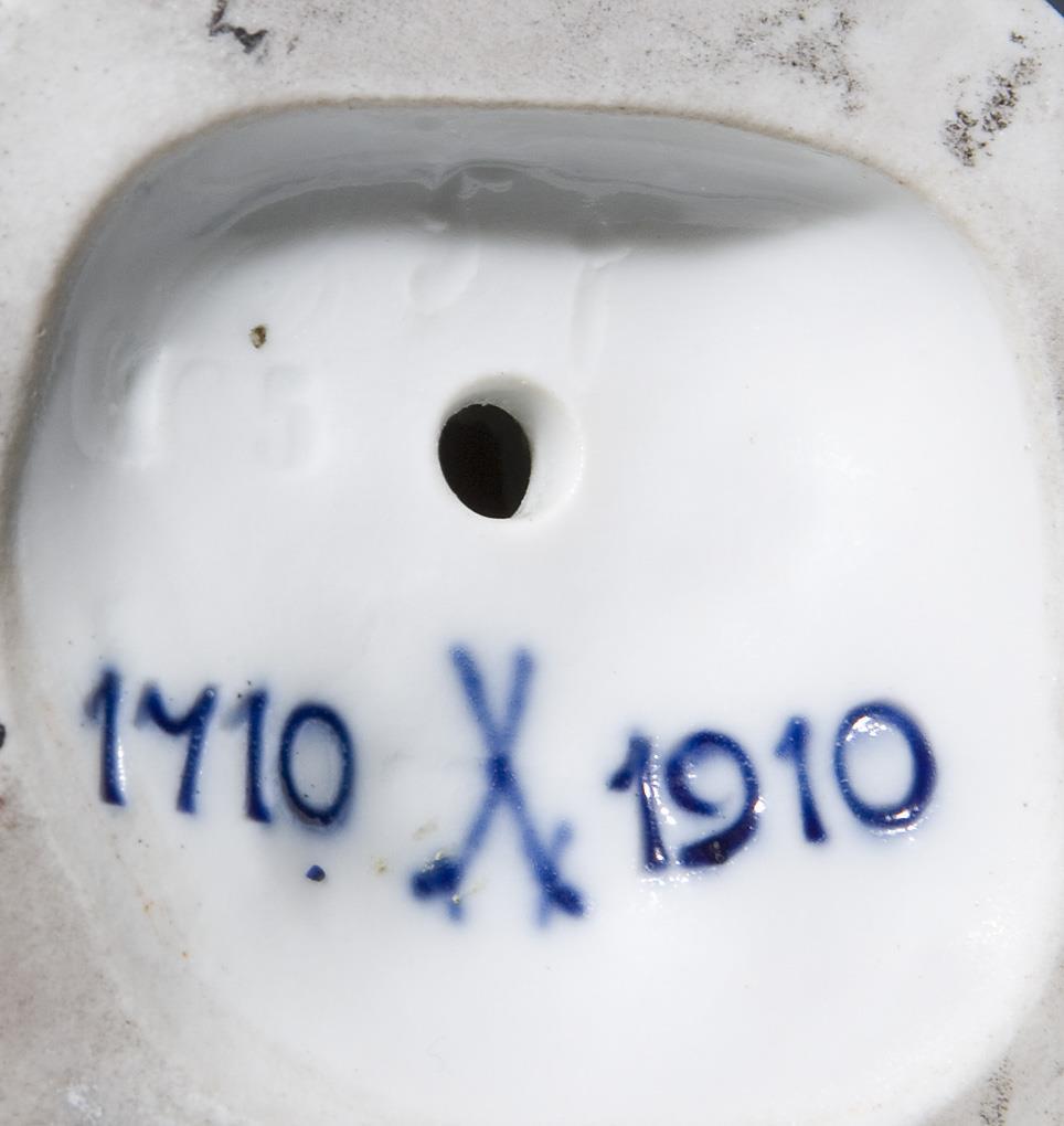 Model by Peter Reinicke 1745. Colorfully painted, gold painted. Incised mark, pressed mark, sword mark, jubilee mark 1710-1910. One finger missing.