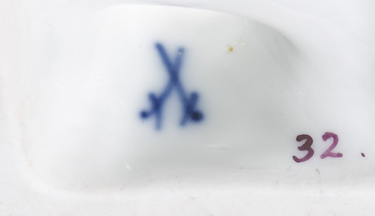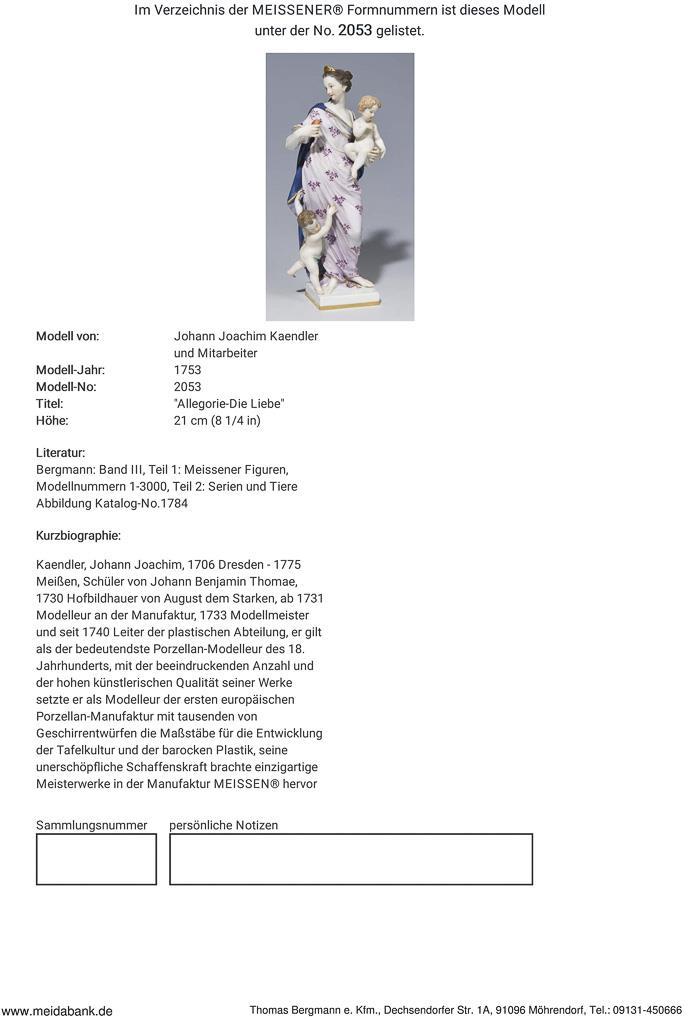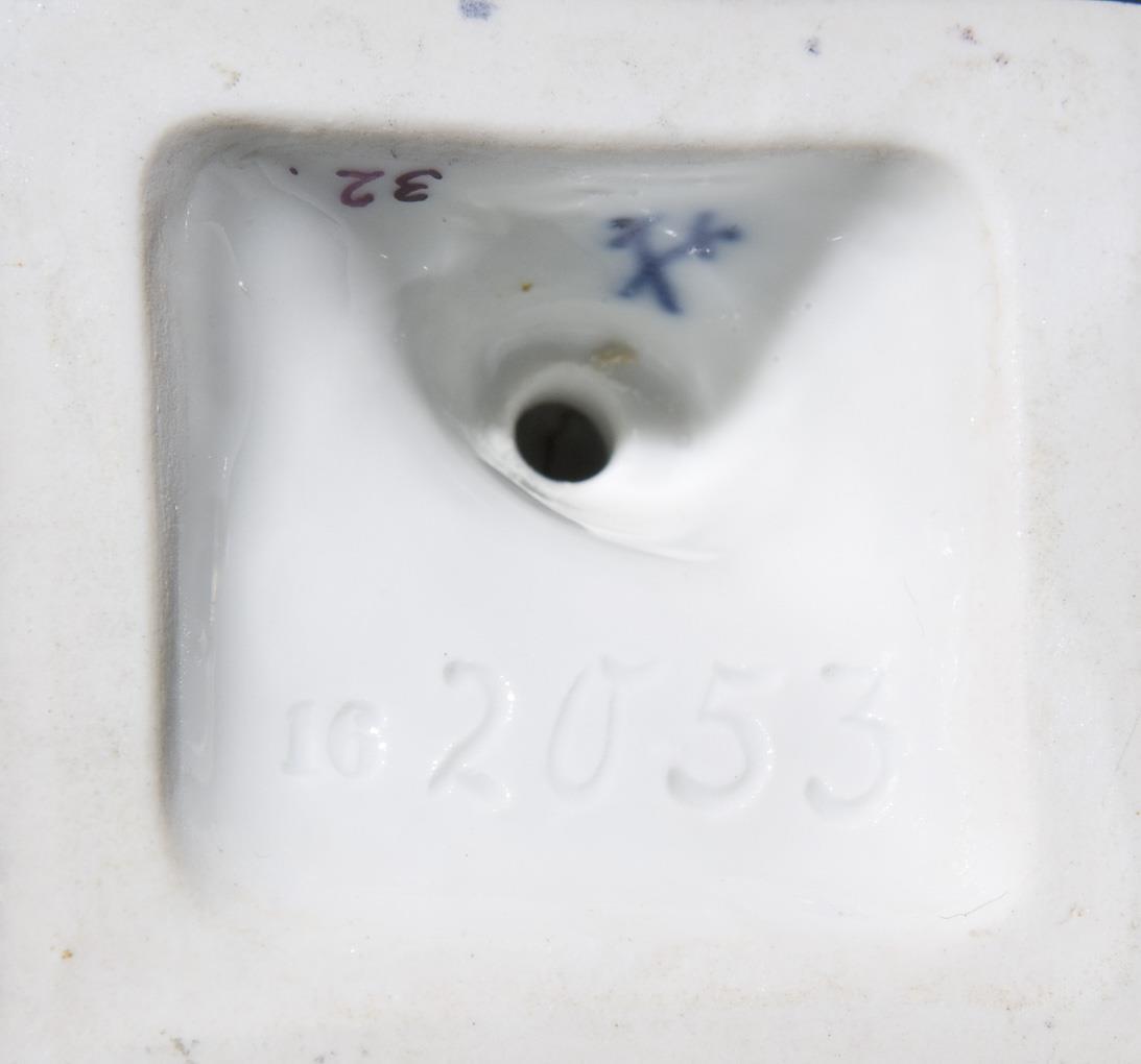 Model by Johann Joachim Kaendler and co-workers 1753. Colorfully painted, gold painted. Incised mark, press mark, painter's mark, sword mark. Cape tail on the left arm bumped.
