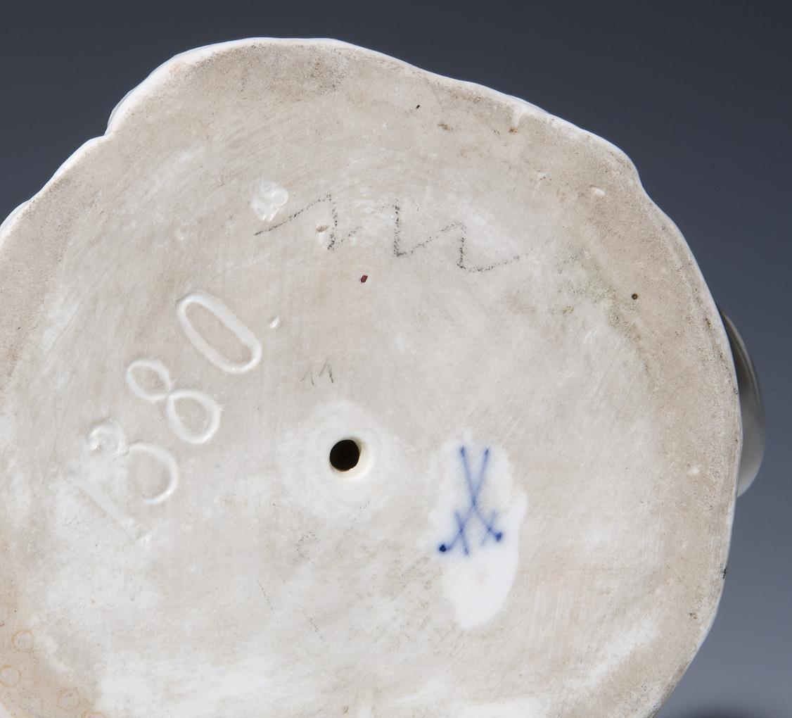 Model by Johann Joachim Kaendler and co-workers 1750. Colorfully painted, gold painted. Unglazed base, incised mark, pressed mark, sword mark. Yarn roll bumped, one hand restored with fabric remnant.