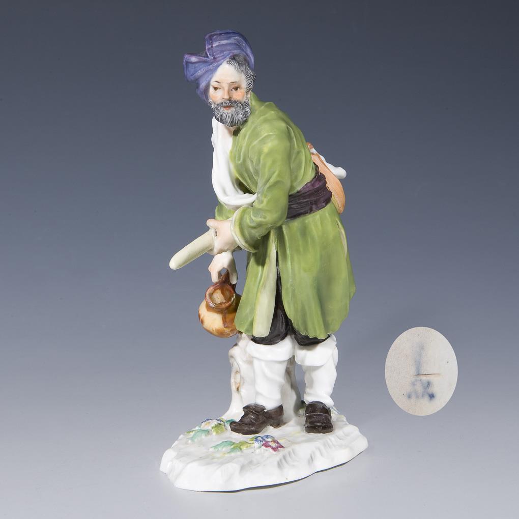 Model by Johann Joachim Kaendler and associates 1752. colorfully painted. Unglazed base, painter's mark, sword mark once painted. Hat, stick, one hand restored.