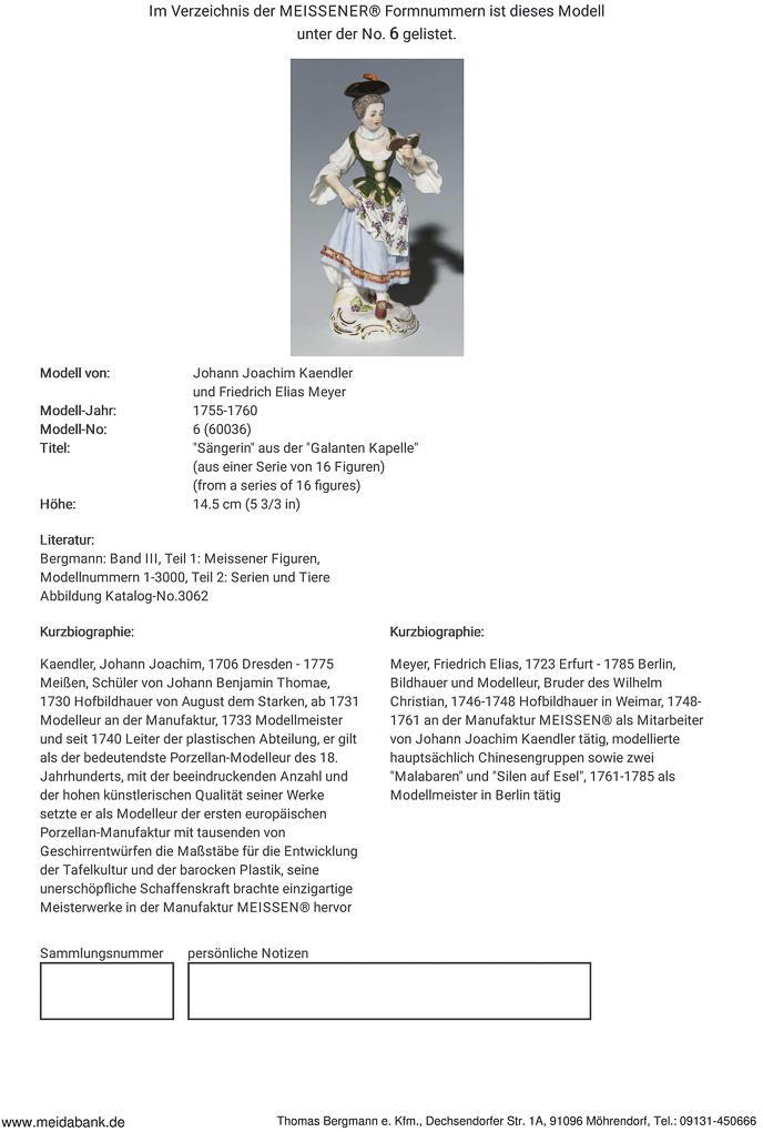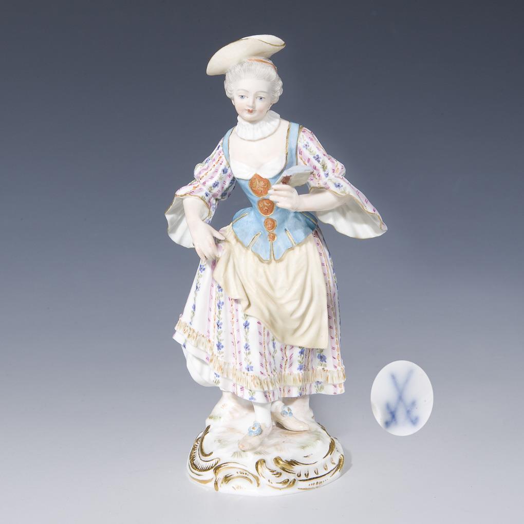 Model by Johann Joachim Kaendler and Friedrich Elias Meyer 1755-1760. From a series of 16 figures. Painted in colors, painted in gold. Incised mark, press mark, painter's mark, sword mark. One thumb, hat feather, book, base minimally bumped.