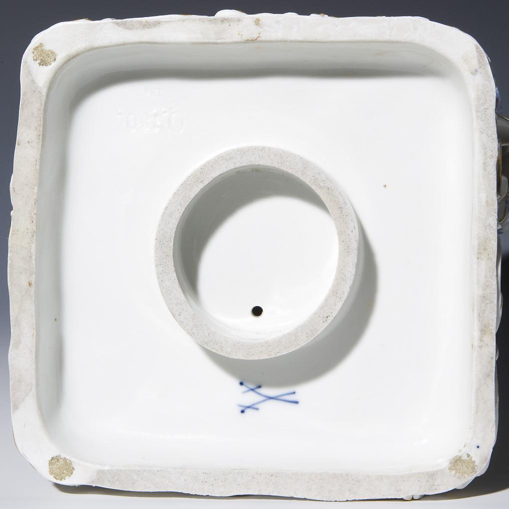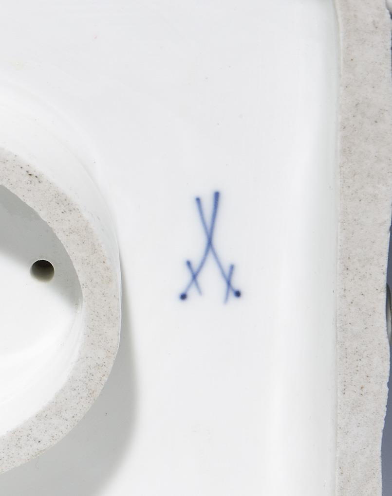 Model by Friedrich Offermann 1889-1890. Colorfully painted, gold painted. Incised mark, press mark, painter's mark, sword mark. Flowers, leaves, a forearm, an arm ruffle, cupid half restored.