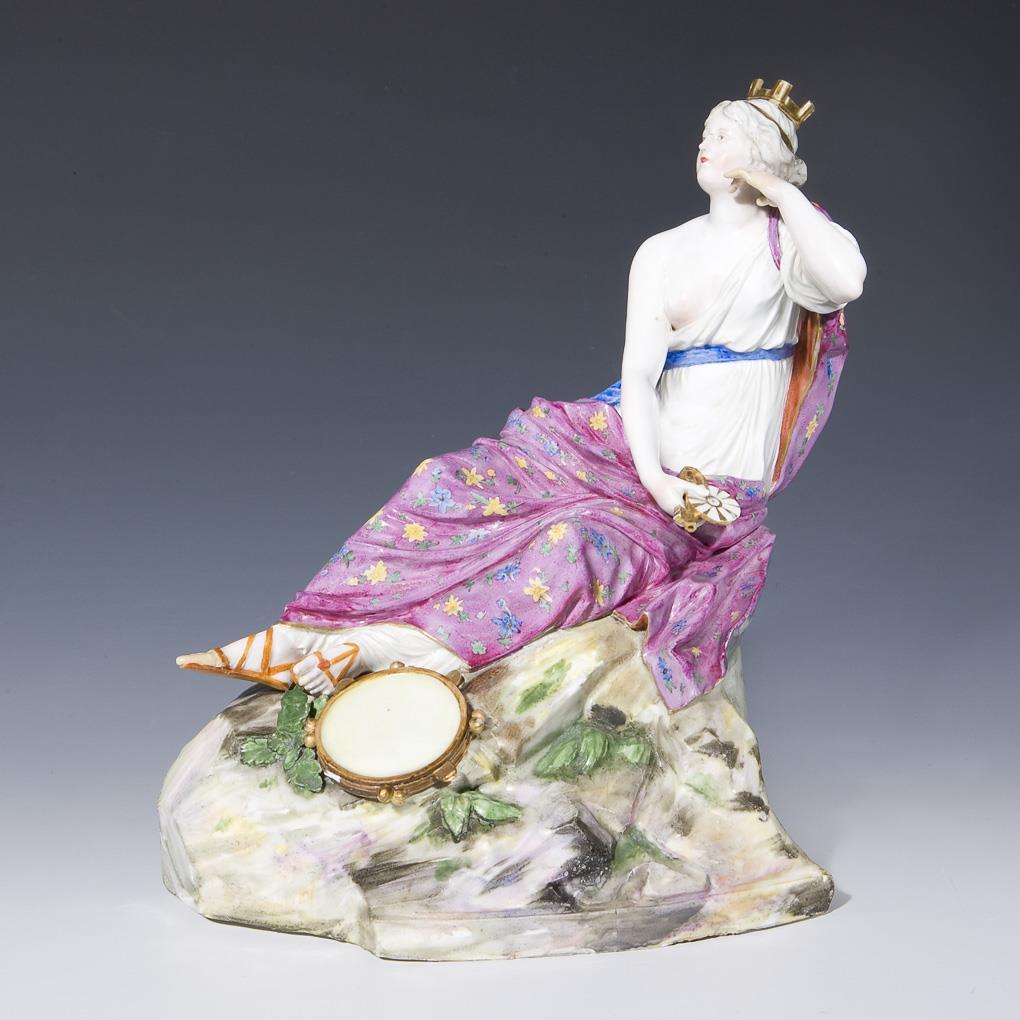 Nach einem Meissen-Modell von Michel Victor Acier 1768 (Form-Nr. C 7). Figur aus dem 7-teiligen Tafelaufsatz. Farbig bemalt, gold staffiert. Schwertermarke mit Stern und Malermarke. Sockel mehrfach gerissen, Zehen an einem Fuß, Finger einer Hand sichtbar alt restauriert, eine Schelle bestoßen, kleiner Haarriss an der Nase.