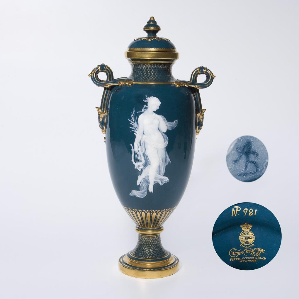 Pâte-sur-pâte lidded vase. Stoke-on-Trent, Mintons manufactured for Gilman Collamore & Co. New York.