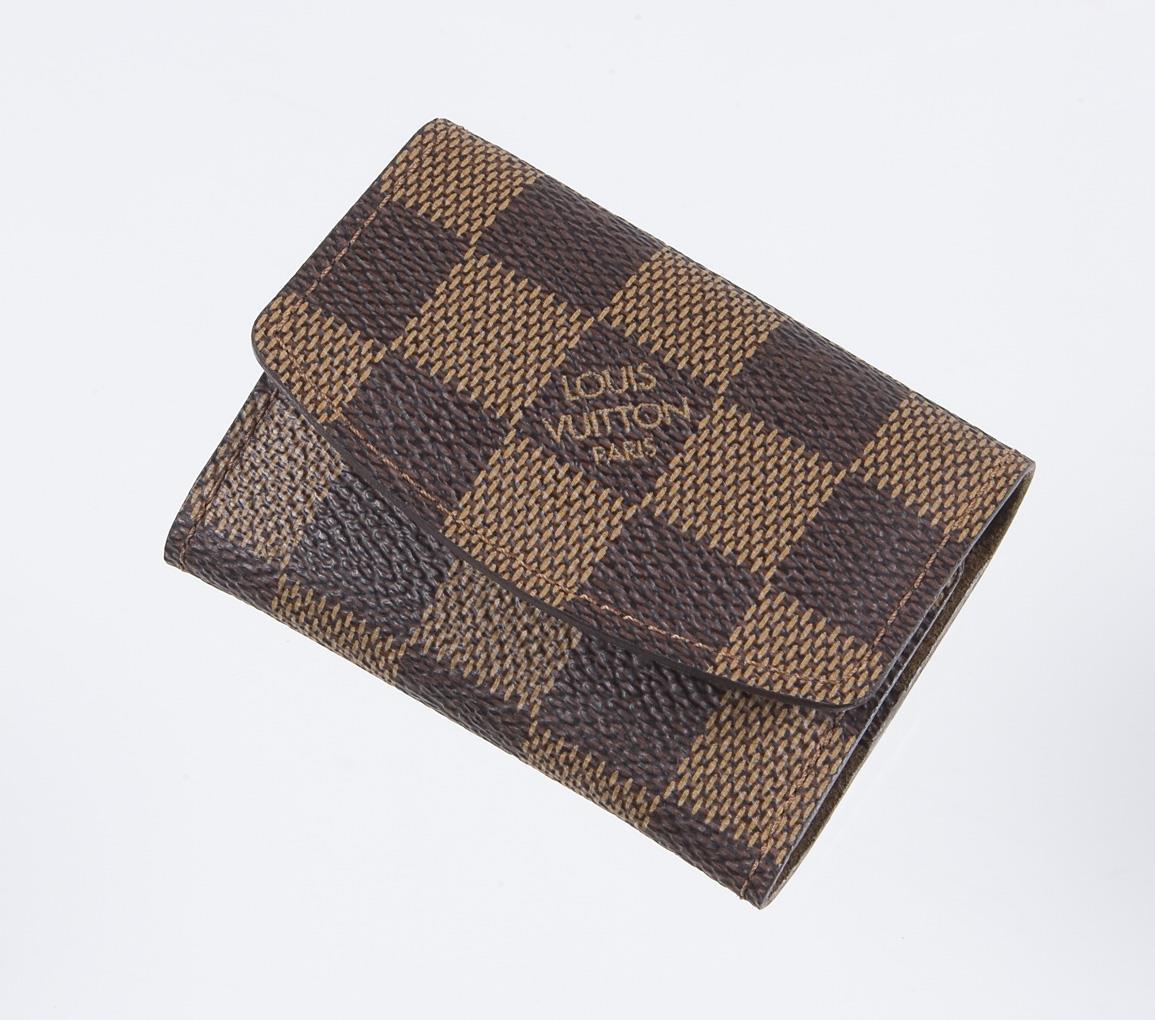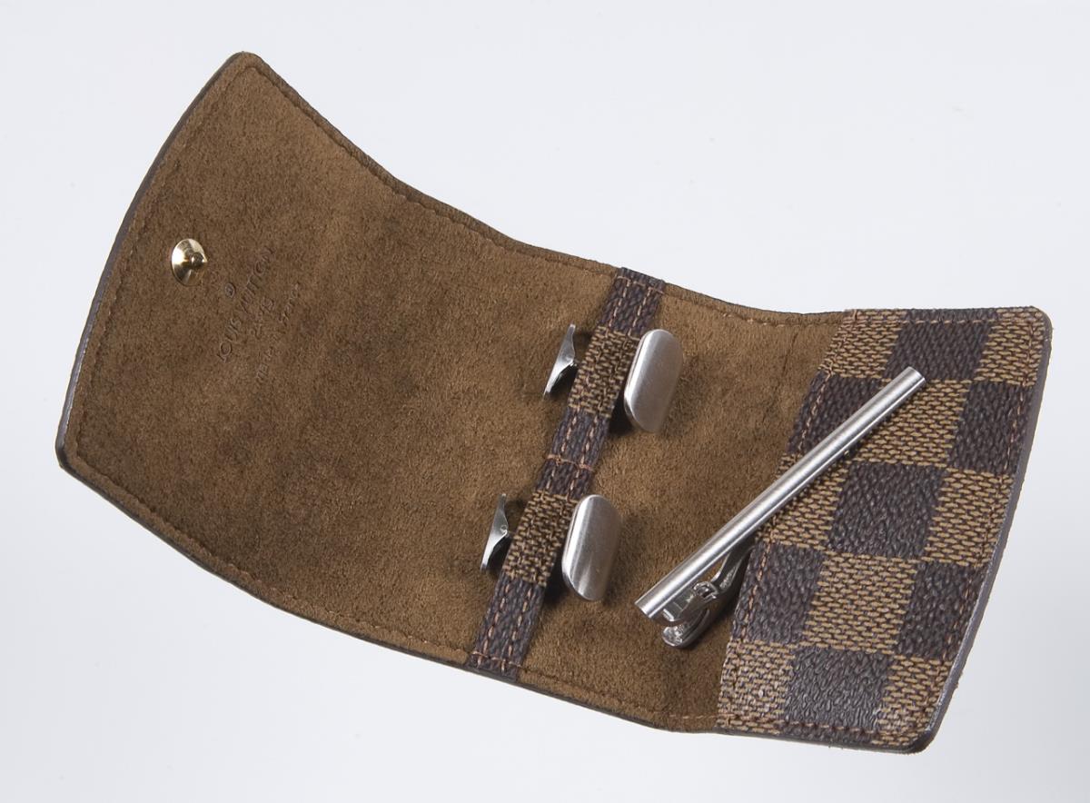 Simple smooth shape. Solid worked. Hallmarks: Fineness. Louis Vuitton case, Paris, Made in France. Damier canvas exterior, leather interior. Closure with flap and push button.