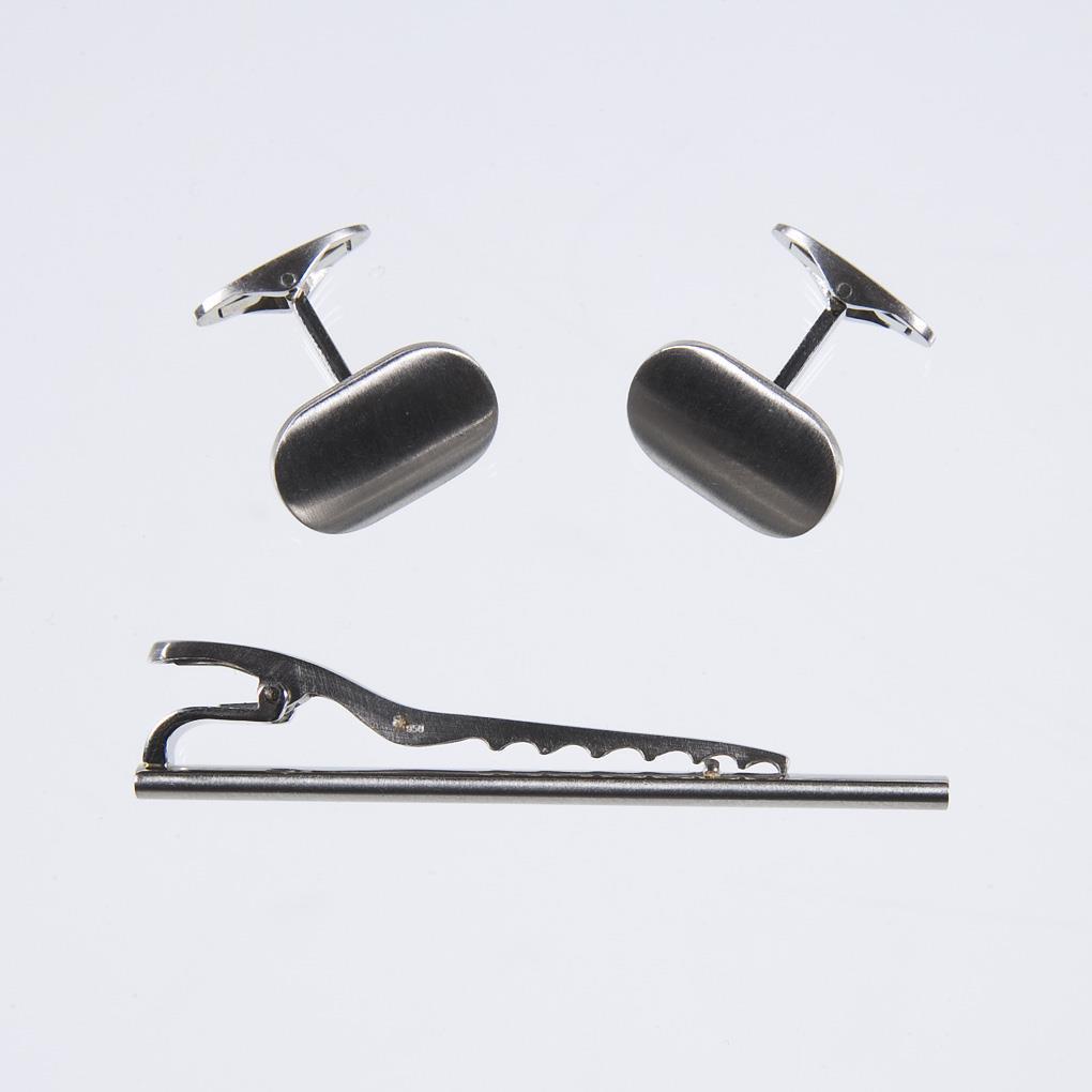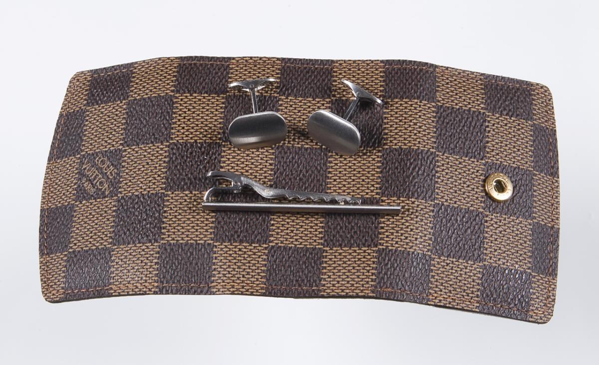 Pair of platinum cufflinks, platinum tie pin in Louis Vuitton case.