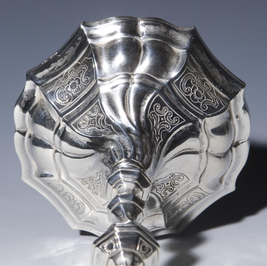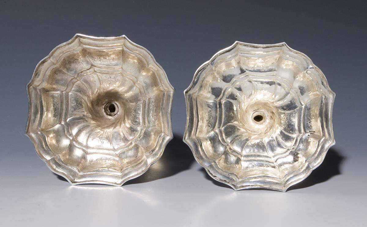 Single-light stand candlestick in rococo style, floral engraving. Removable drip trays. Hallmarks: French import stamp since 1893, Swedish import stamp since 1912, fineness. One stem crooked.