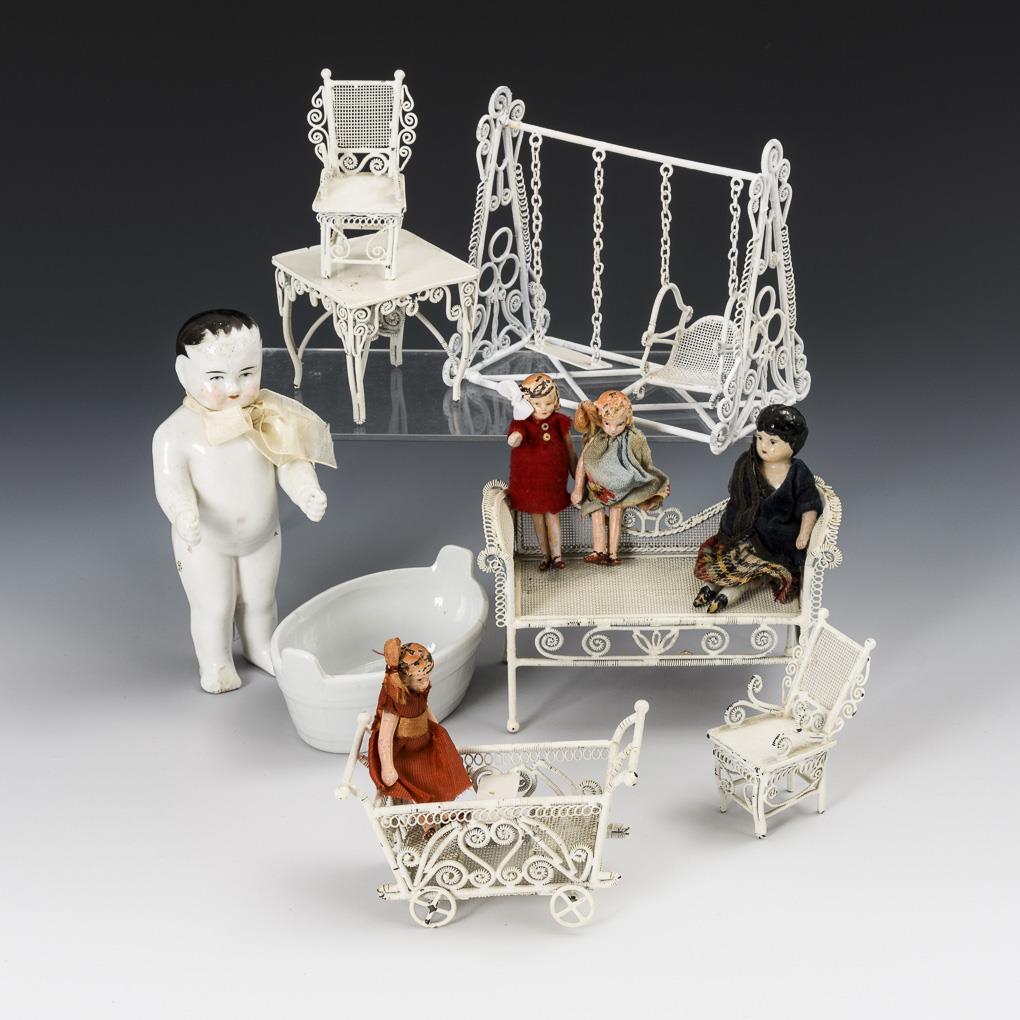 Table, 2 chairs, larger bench, twin carriage and swing. H 5,5 - 12 cm. / "Nackfrosch" with black hair, chest head doll and 3 small sprayed whole bisque dolls. L 7,5 - 15 cm. / In addition, oval bathtub of glazed porcelain. Played with, dolls with defects. 1 wheel on the carriage is missing.