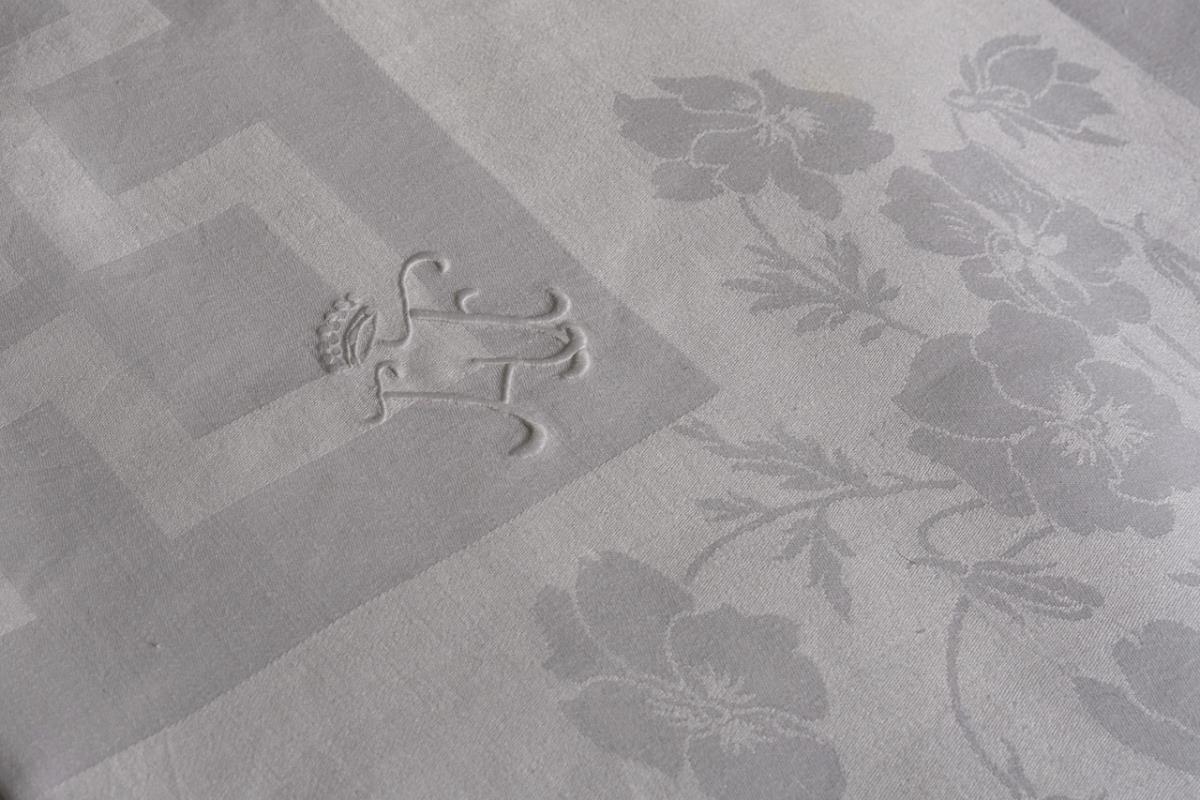 Very large cloth with surrounding border of pansies, in the corners as large bouquets. Following inward, wide meandering band and bouquets of poppies and clovers with flowers, evenly distributed over the entire cloth. White embroidered monogram "LF" under baronial crown. Unused / once washed.