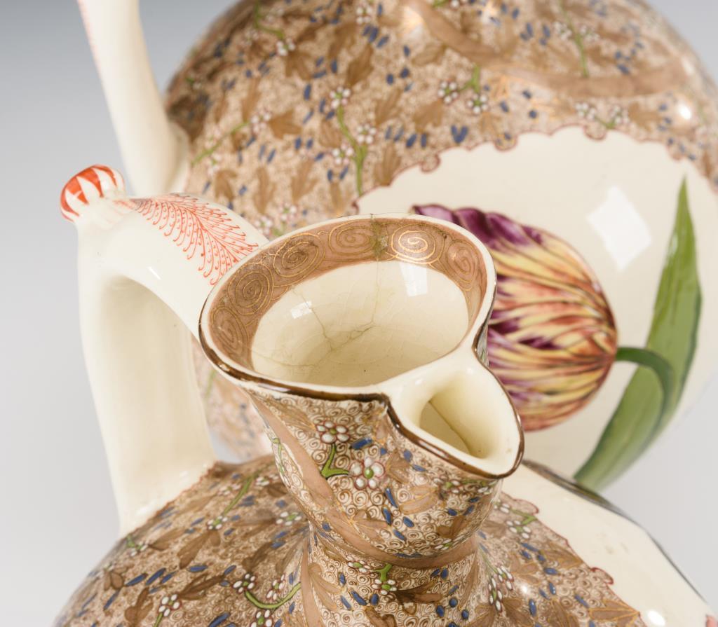 Kugelbauchform mit gekniffenem Ausguss und Bandhenkel mit kugeliger Daumenrast. Schlickerbemalung mit Hahn- und Tulpenmotiv umgeben von einem Blütenfond. 1 Ausguss geklebt, 1 Schneppe bestoßen, partiell leicht berieben.