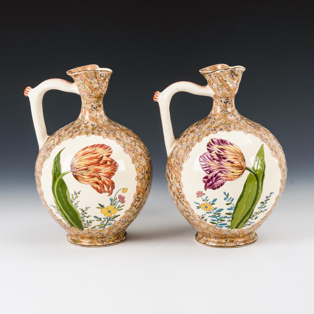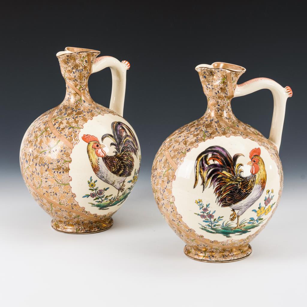 Paar Gründerzeit-Henkelkrüge mit Hahnenmotiv