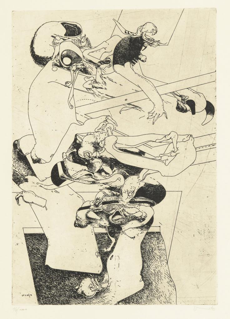 Untitled, copy: 14/50, dated in the plate: "23.3.68", printing plate: 30,8 x 25,5 cm, framed & behind glass: 60 x 50 cm, image area somewhat light browned | Untitled, copy: 16/100, dated in the plate: "24.3.68", printing plate: 33.6 x 23.5 cm, sheet: 54 x 38 cm, framed & behind glass: 65 x 50 cm, sheet margin somewhat light browned and grip.