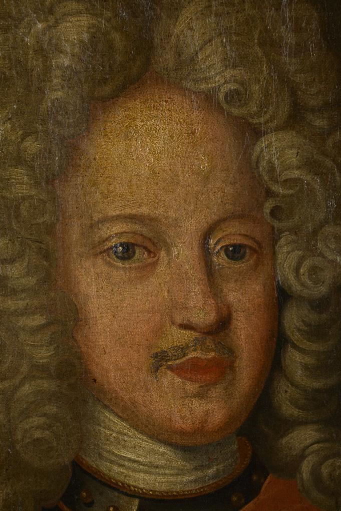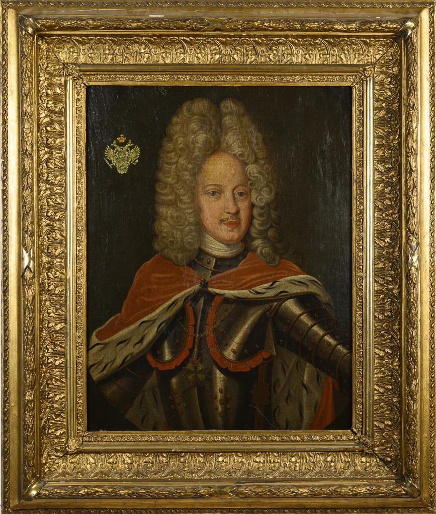 Portrait of a ruler in armor with ermine, allonge wig and the order "Ordre de la Générosité", top left the coat of arms of the Russian Tsarist Empire. It could be Carl Ewald Rönne (1663-1716), general of cavalry and close confidant of Tsar Peter the Great. Alter traces.