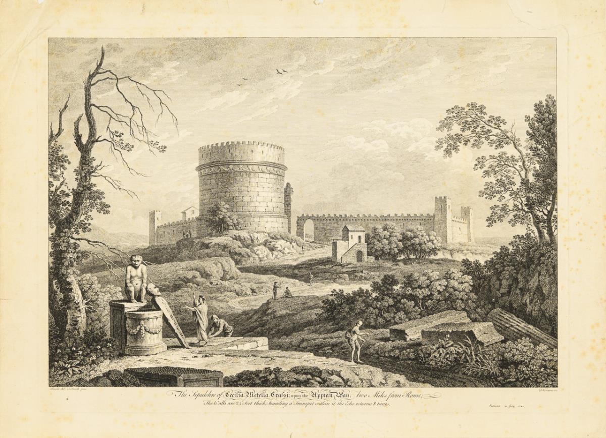 Ansicht des Grabmonumentes der Caecilia Metella an der Via Appia Antica in Rom, betitelt und beschriftet "The Sepulchre of Cecilia Metella Grassi; uppon the appian Way, Two Miles from Rome; The walls are 25 Feet thick, sounding a trumpet within it the Echo returns 8 times", "published 25 July 1746", nach einem Gemälde von T. Smith. Knick- und griffspurig, stockfleckig, Randbereich rissig, Randbereich teils hinterklebt.
