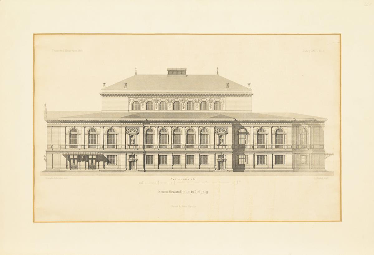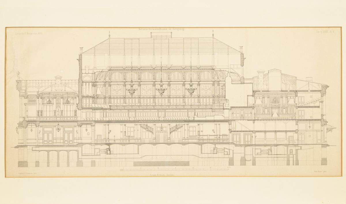 4 architectural plans to "New Gewandhaus in Leipzig" by Martin Gropius and Heino Schmieden; from the Journal of Civil Engineering 1886, Volume XXXVI, sheet 1: "first floor", sheet 2: "floor plan at lodge level, floor plan at hall level", sheet 4: "side view" and sheet 6: "longitudinal section". Sheet each light browned, sheet 1 with tear at the lower right corner.