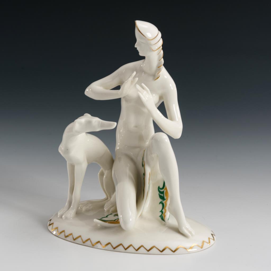 Art-déco-Figur eines sitzenden Frauenaktes mit Windhund.