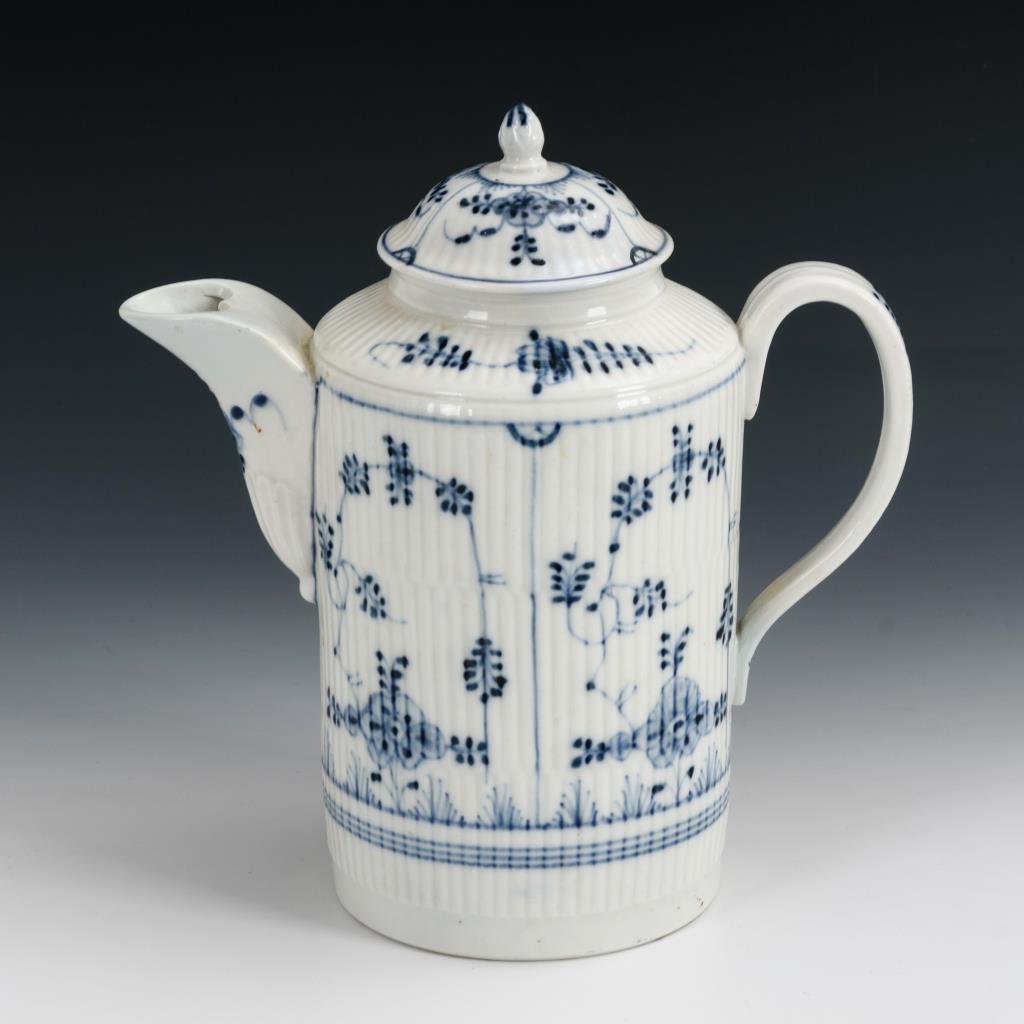 Zylinderkanne mit gebrochen gerippter Wandung. Deckel und Schneppe restauriert.