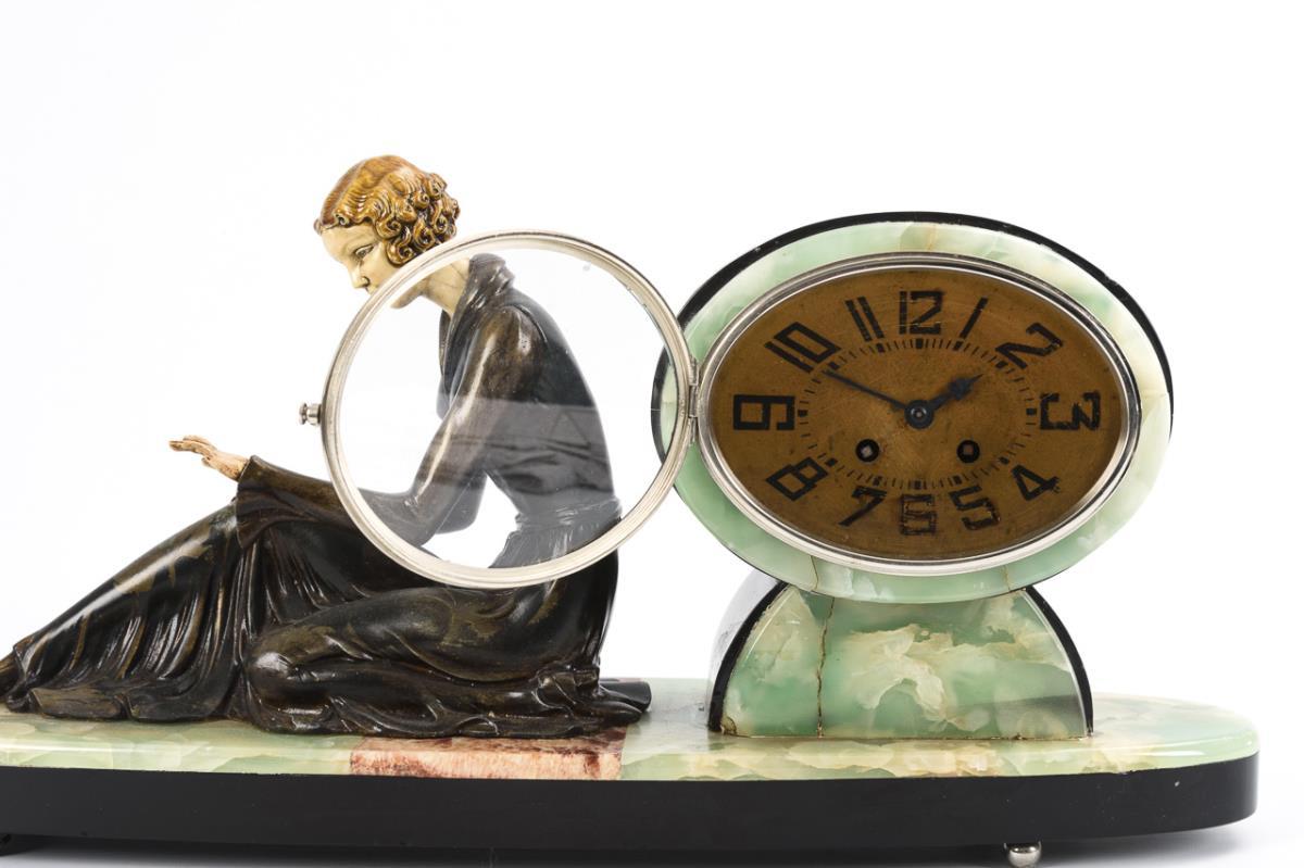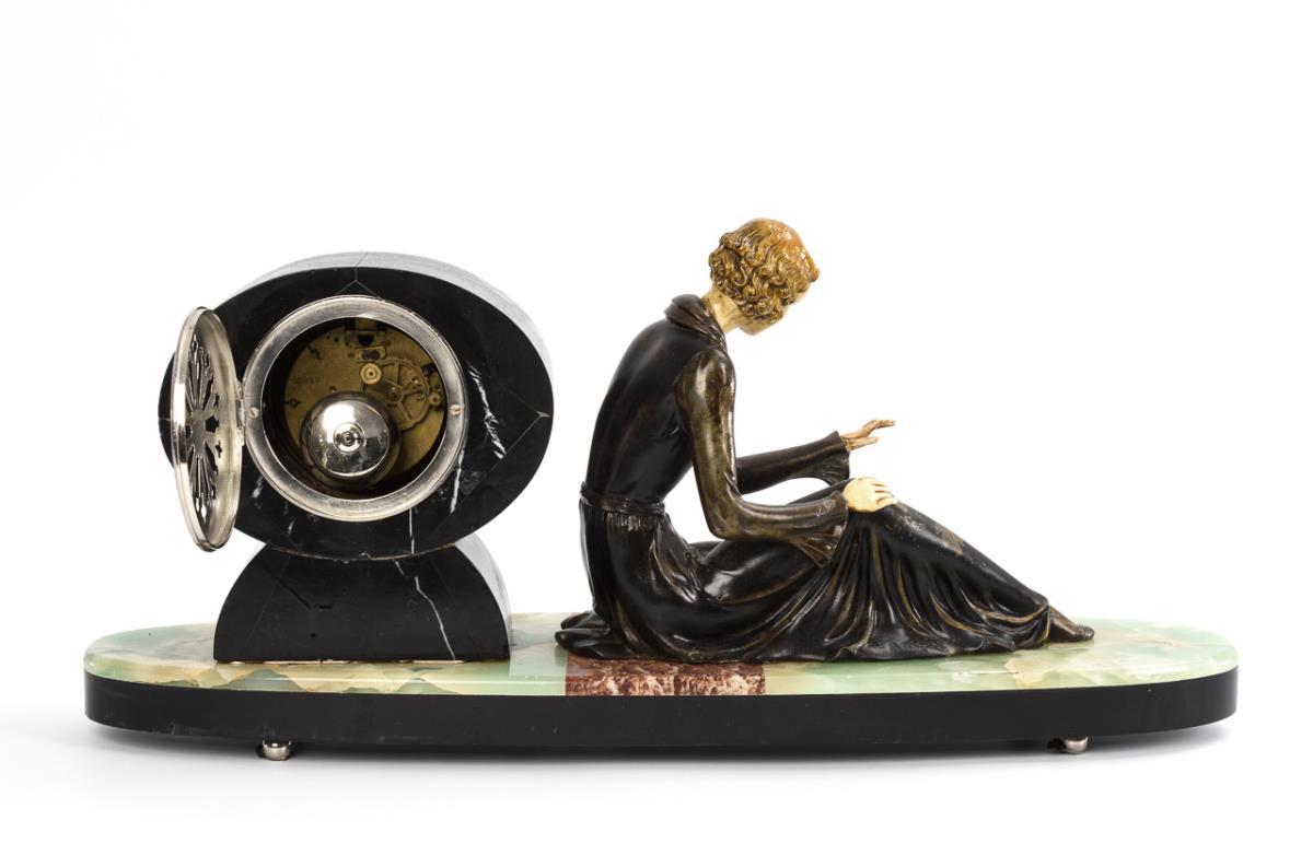 Oval base with a female figure made in the style of Demétre Chiparus, seated looking at her fingers. Slight signs of age and use, edge and finger defects, dial with rubbing, striking and walking movement and pointer position defective.