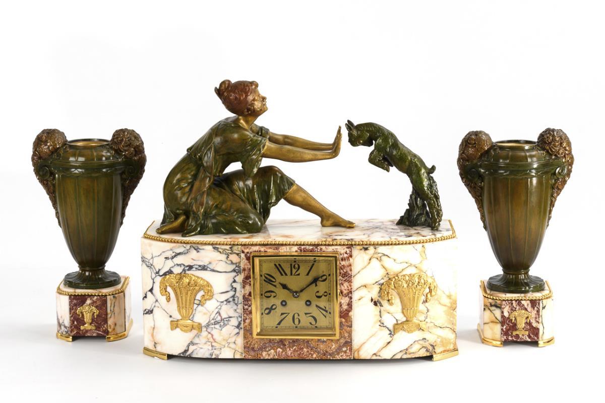 Various colored marble, bronzed metal casting, bronze/brass repainted. Clock approx 44.5 x 50.5 x 18 cm, side plate H 35 cm. Total 28 kg.