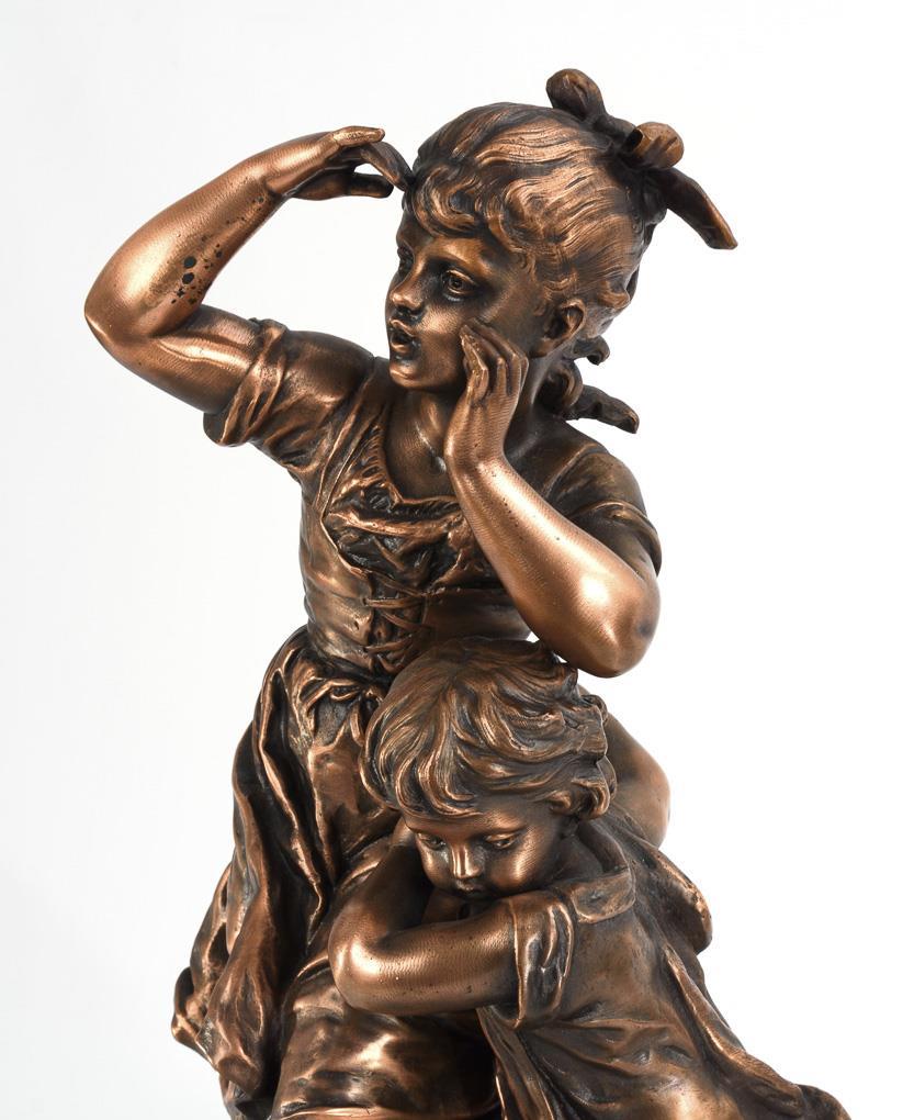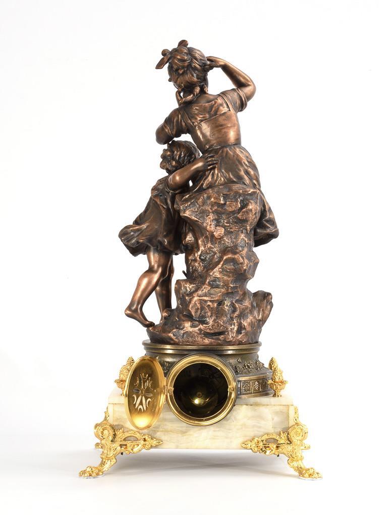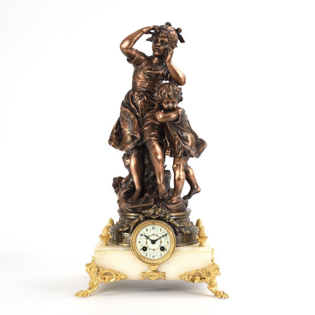 Stepped case with gilded applications, crowned by 2 small children with a landing net on a natural base. Made after the model of the French sculptor Hippolyte Francois Moreau (1832-1927). Use old and new parts, bell loosened.