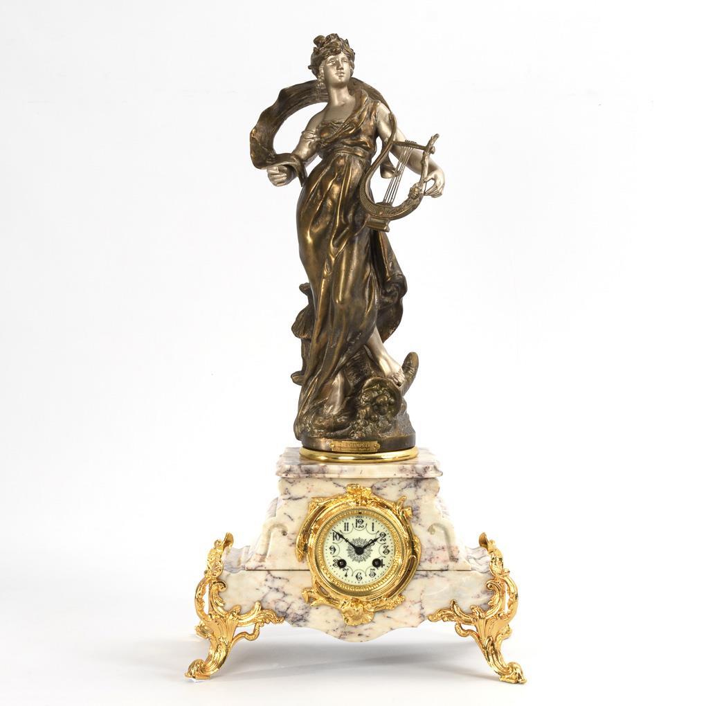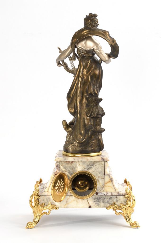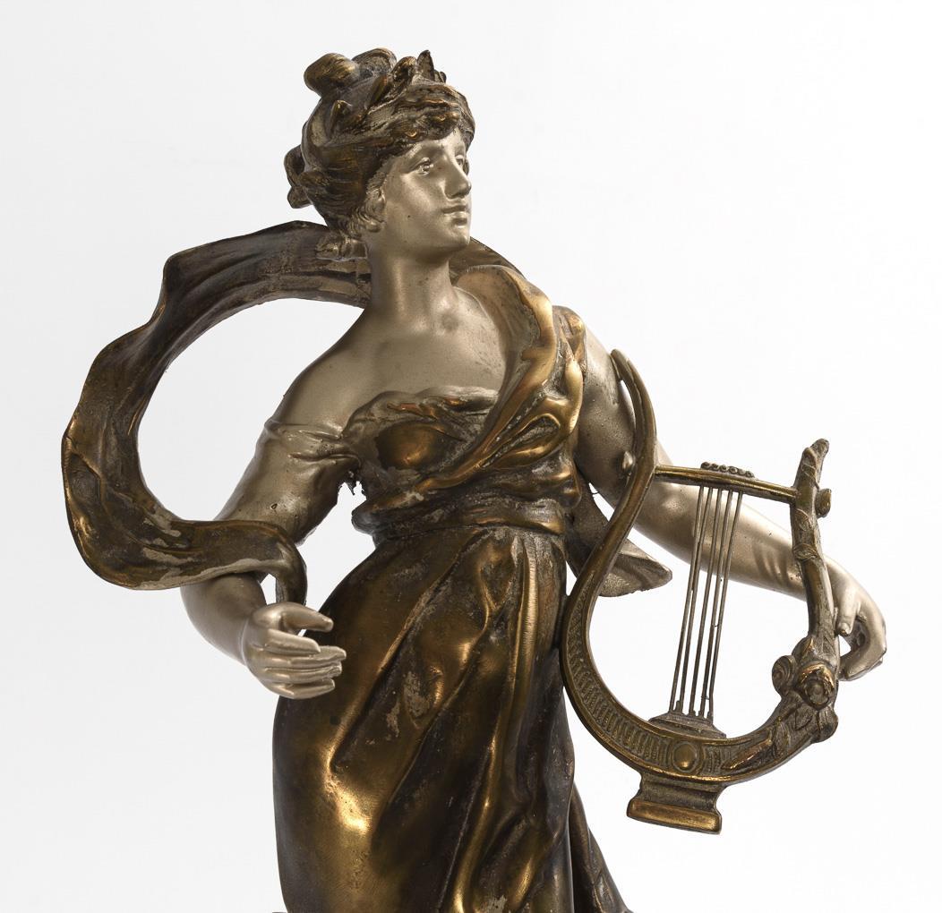Elegant stepped case, crowned by an antique Art Nouveau female figure as a muse of poetry on a natural base with cornucopia. Made after the model of the French sculptor Louis Auguste Moreau (1855-1919). Use of old and new parts.