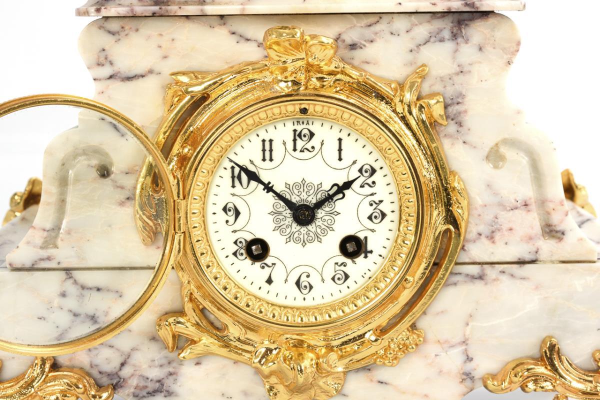 White purple veined marble, cast metal bronzed and partially silvered, bronze/brass repainted. Approx. 70 x 36.5 x 22 cm. 12.3 kg.