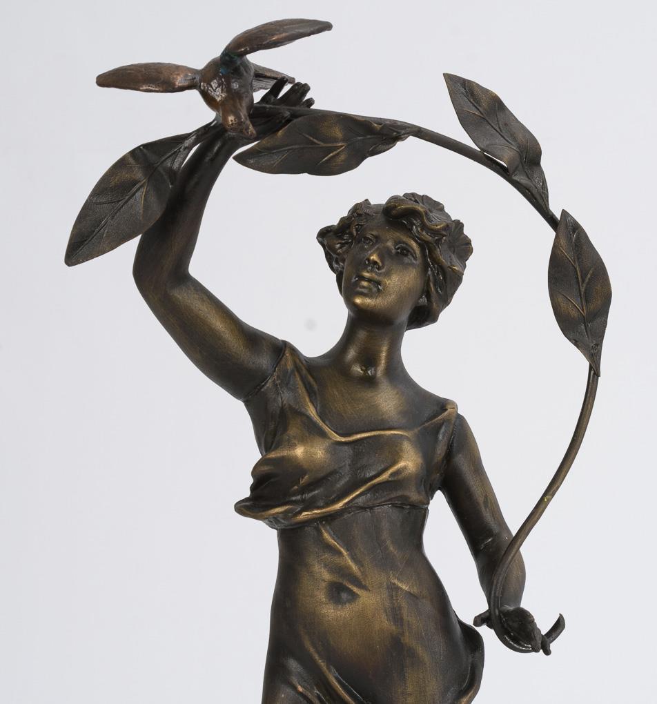 Tiered base with bronze appliqués, crowned by a girl with bird and leafy vine (spring messenger). Made after the model of the French sculptor Charles Theodore Perron (1862-1934). Use of old and new parts.
