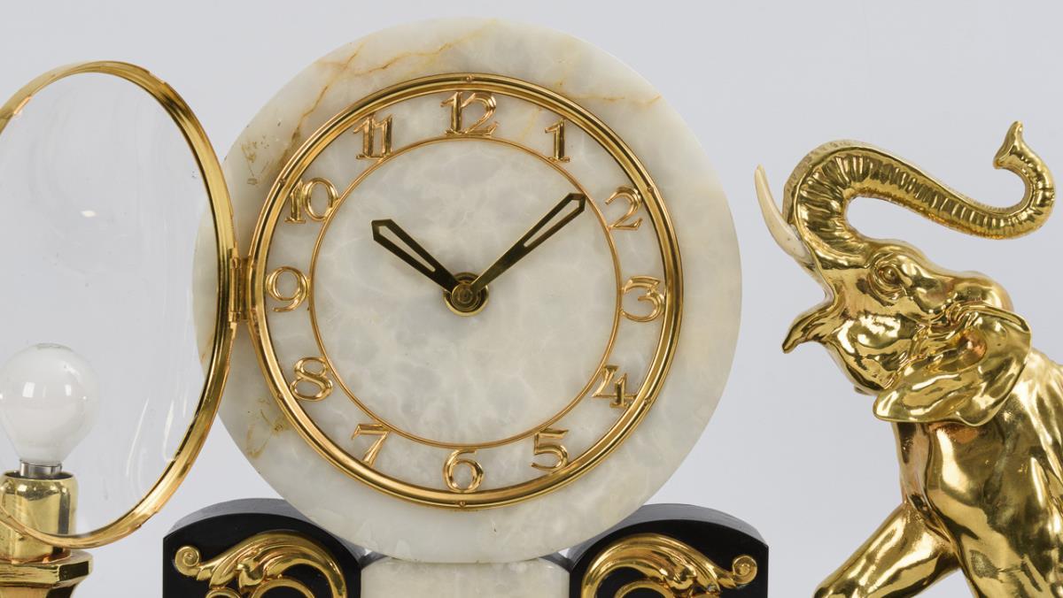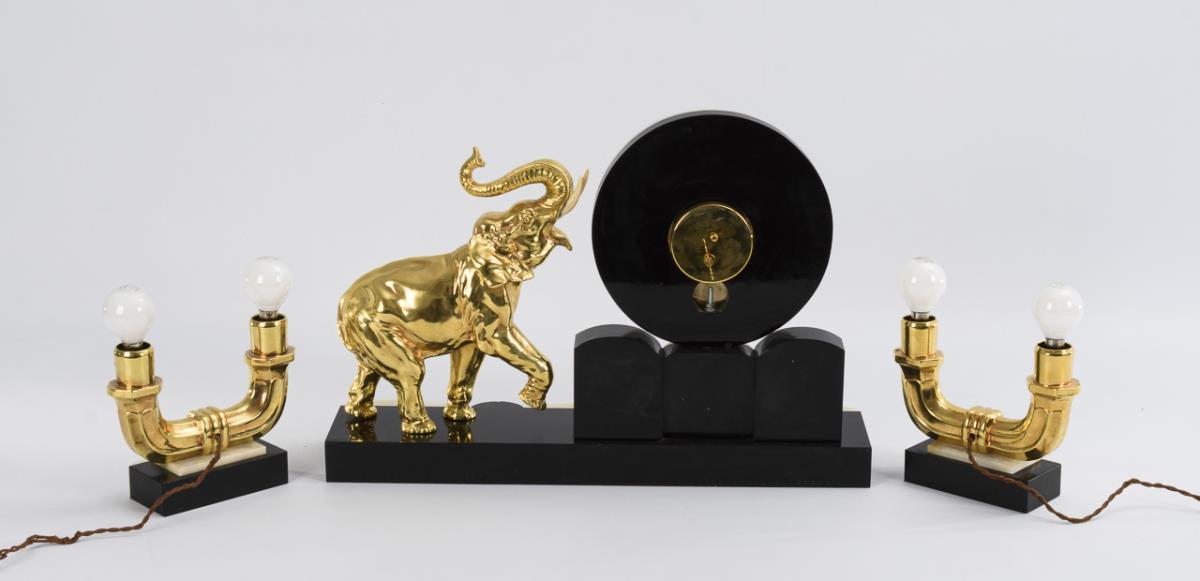 Flat base in Art Deco style with curved projections, large glazed dial with Arabic numerals and modern hands and plastic elephant. Comes with a pair of matching electrified, 2-flame side plates with screw thread, function tested, without shades. Use old and new parts, cable in need of renewal.