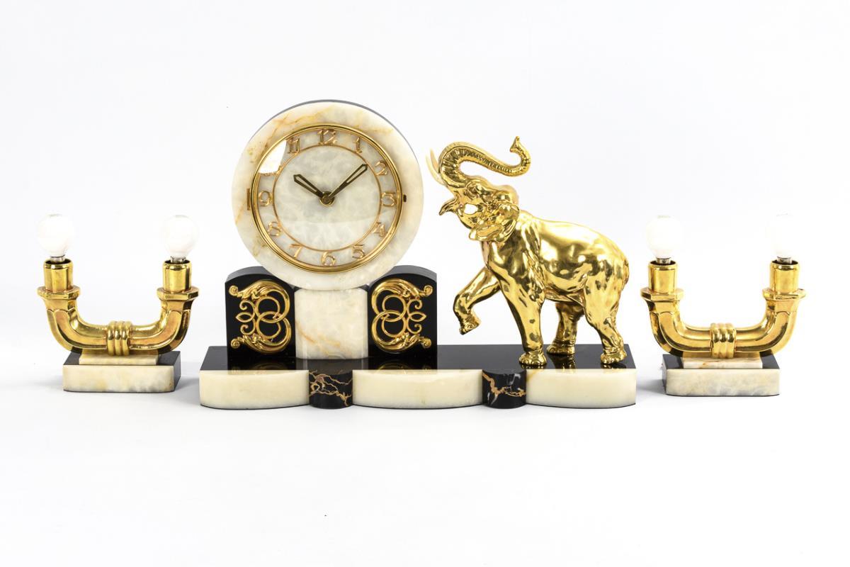 Flat base in Art Deco style with curved projections, large glazed dial with Arabic numerals and modern hands and plastic elephant. Comes with a pair of matching electrified, 2-flame side plates with screw thread, function tested, without shades. Use old and new parts, cable in need of renewal.