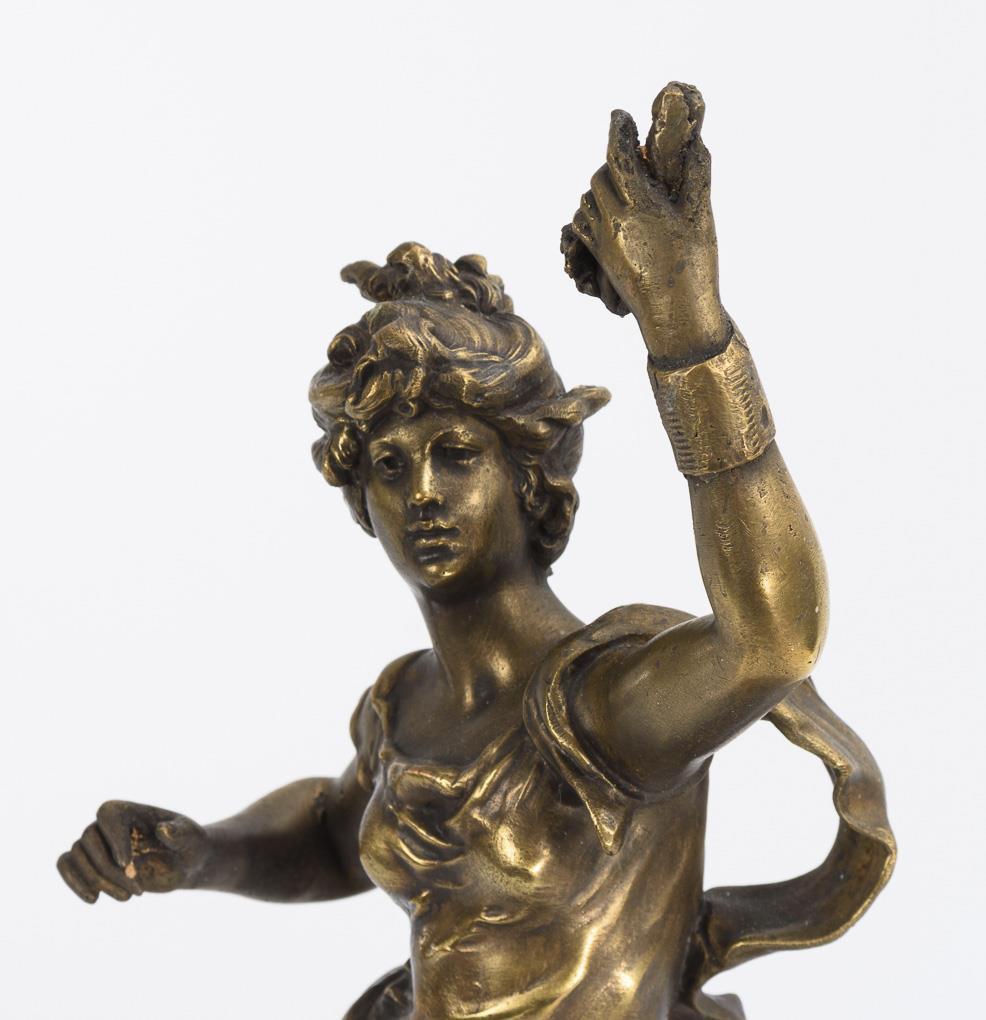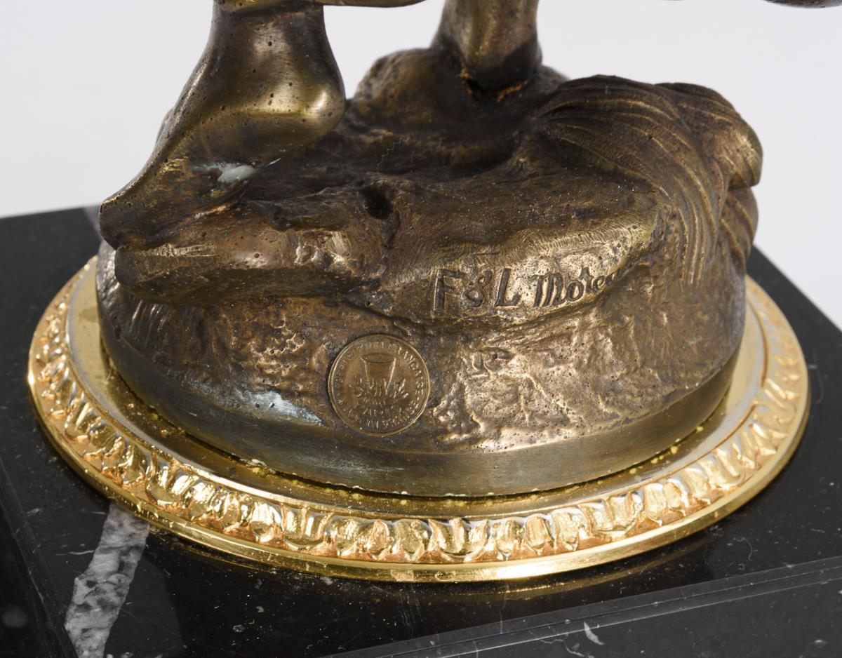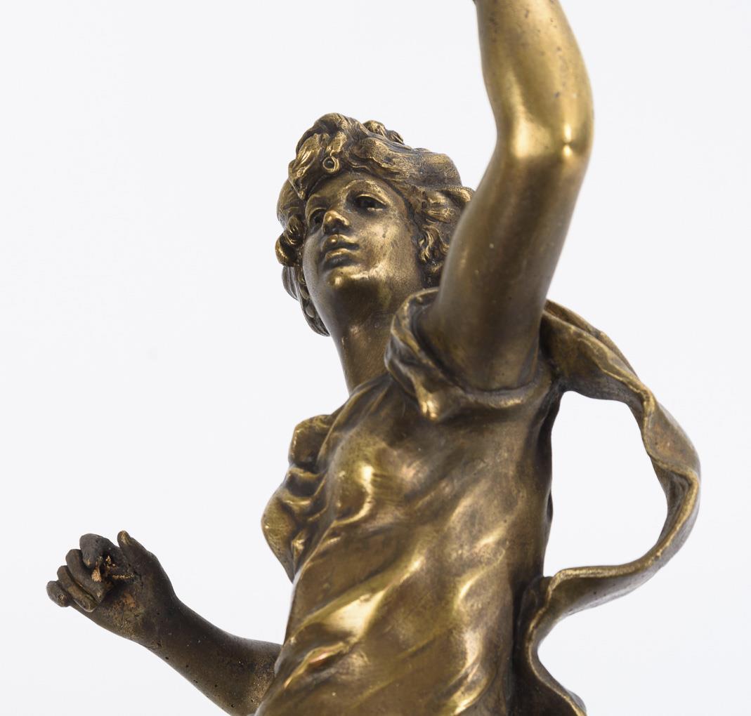 Bronze patinated, gilt bronze plinth, black marble base. Inscribed, foundry mark "Fabrication Francaise, made in France, Paris", inscribed/titled on the front plate. H 46 / 56 cm. 7,3 kg.