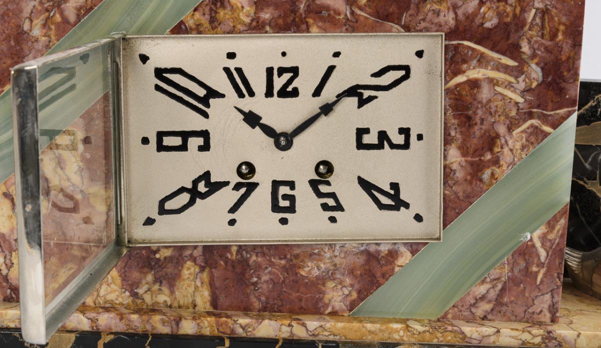 Various colored marble, brass re-set. Clock approx 43 x 52,5 x 12 cm, side plate H 15,3 cm. Total 18,3 kg.