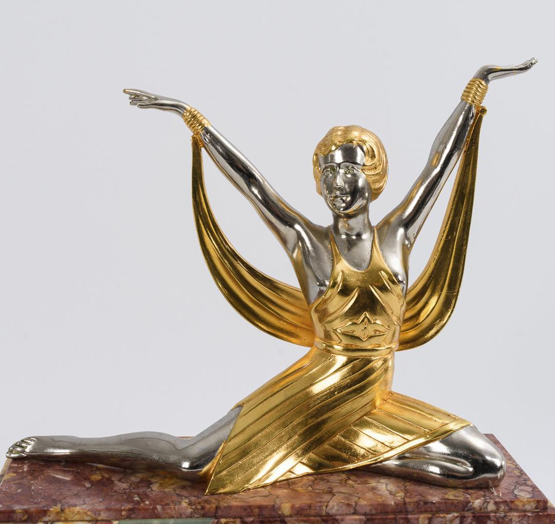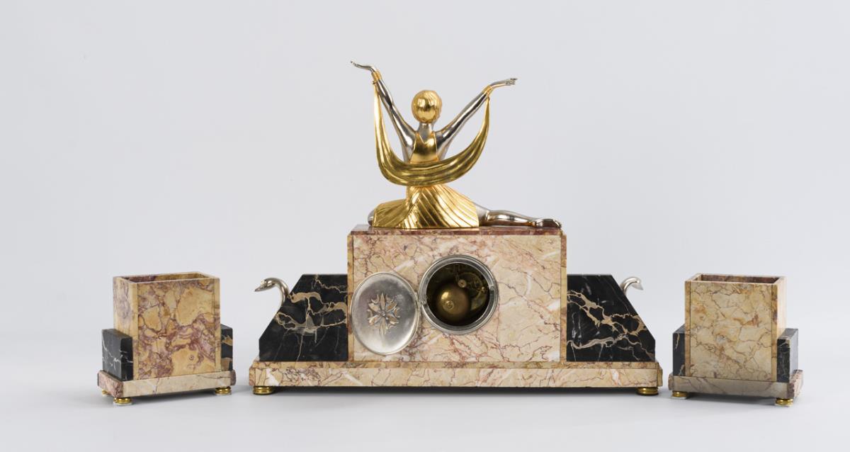 Wide base with rectangular case, flanking swans and a crowning dancer in art deco style. In addition, 2 matching side plates. Use of old and new parts, partial slight edge defects and scratches, dancer loose.