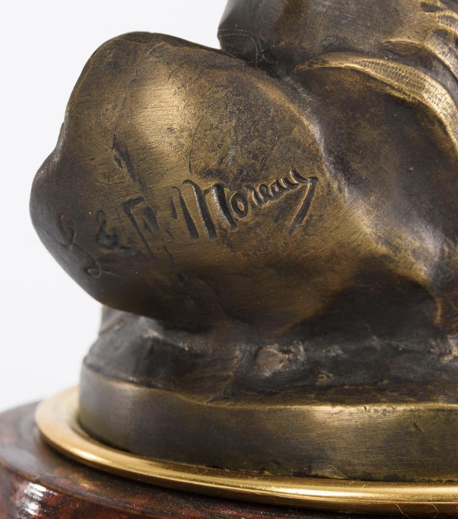 Cast metal bronze patinated, gilded decorative plates and base labels, red marbled wood base. Each inscribed, each inscribed/titled on label. H 41 / 47 cm. Total 5.8 kg.