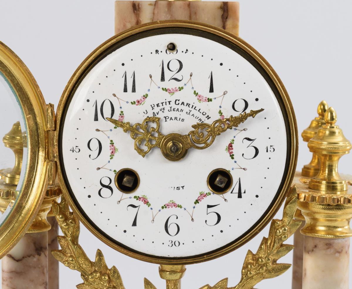 Market movement with half-hour strike on bell, dealer's mark "C.B. Paris", does not run. Glazed white enamel dial with colored festoon painting, Arabic numerals, minute track and Louis XV hands, marked "Du Petit Carillon, 16, Av[en]ue Jean Jaurès Paris".