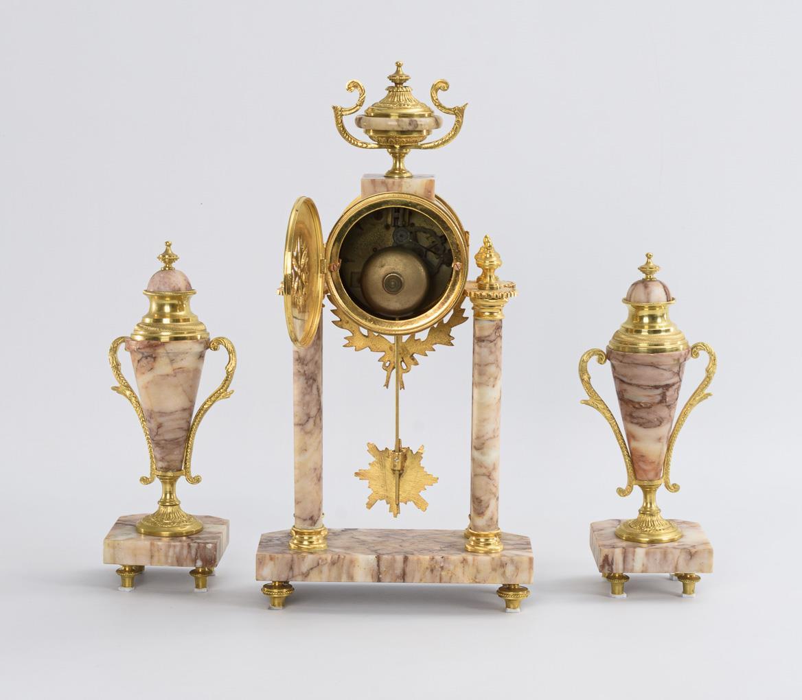 Reddish-white marble, bronze/brass recast. Clock approx 40 x 20 x 9 cm, side plate H 26,5 cm. Total 3,5 kg.