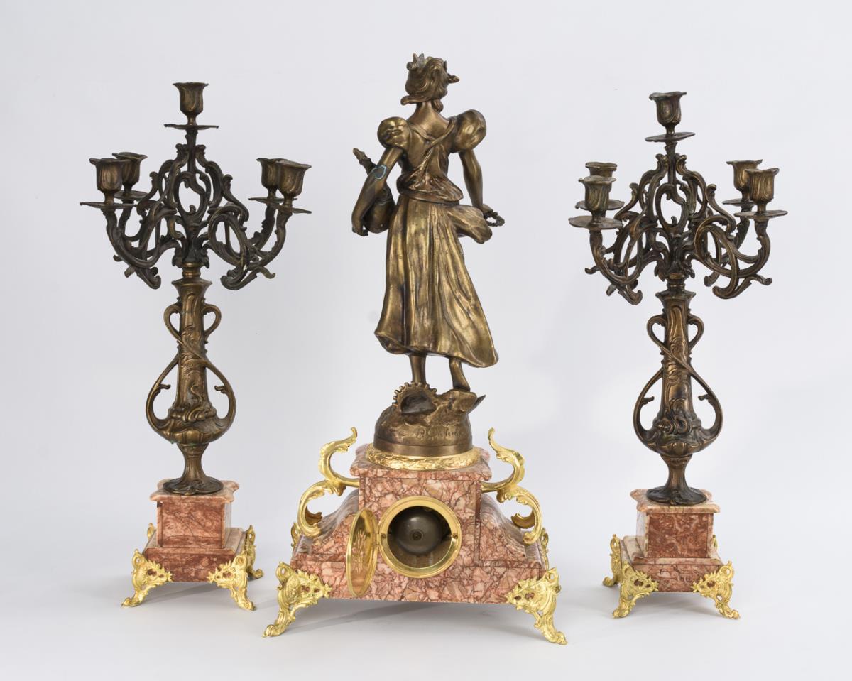 Fireplace clock set with Art Nouveau female figure "Chemin de la Fortune". A.D. Mougin.