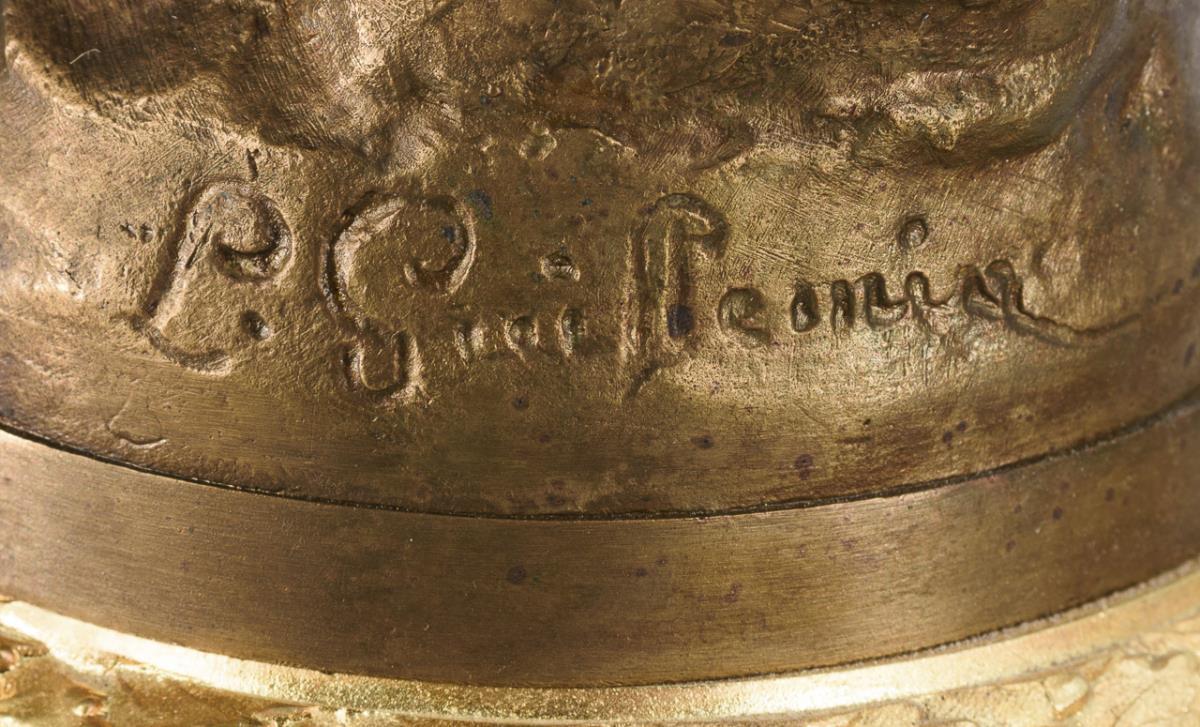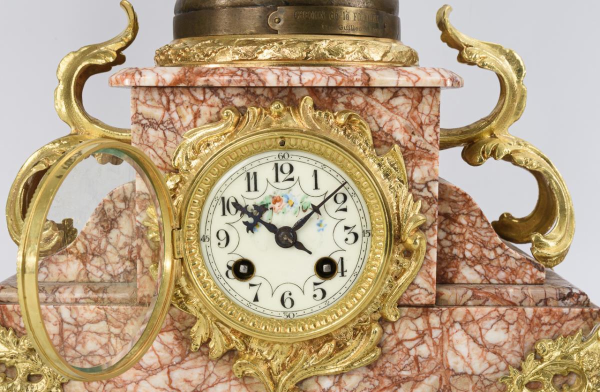 Reddish marble, bronzed metal casting, bronze/brass repainted. Clock approx. 66,5 x 35,5 x 19,5 cm, 9,8 kg. Side plate H 62 cm, total 9.6 kg.