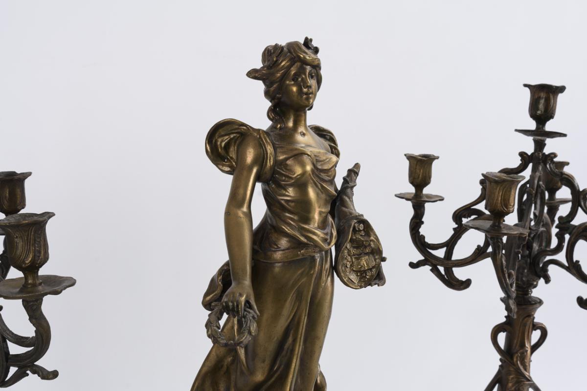 Stepped base with bronze applications, crowning allegory of happiness with money attributes. Accompanied by 2 matching 5-flame side plates with floral relief decoration. Use of old and new parts.