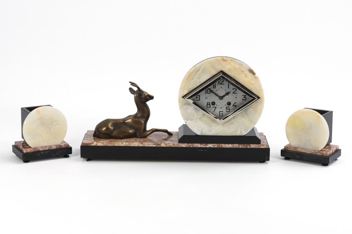 Tiered base with sitting roebuck and geometric clock case in art deco style. In addition, 2 matching side plates with disc front. clock front installed on the back, restoration recommended. Use of old and new parts, traces of glue.