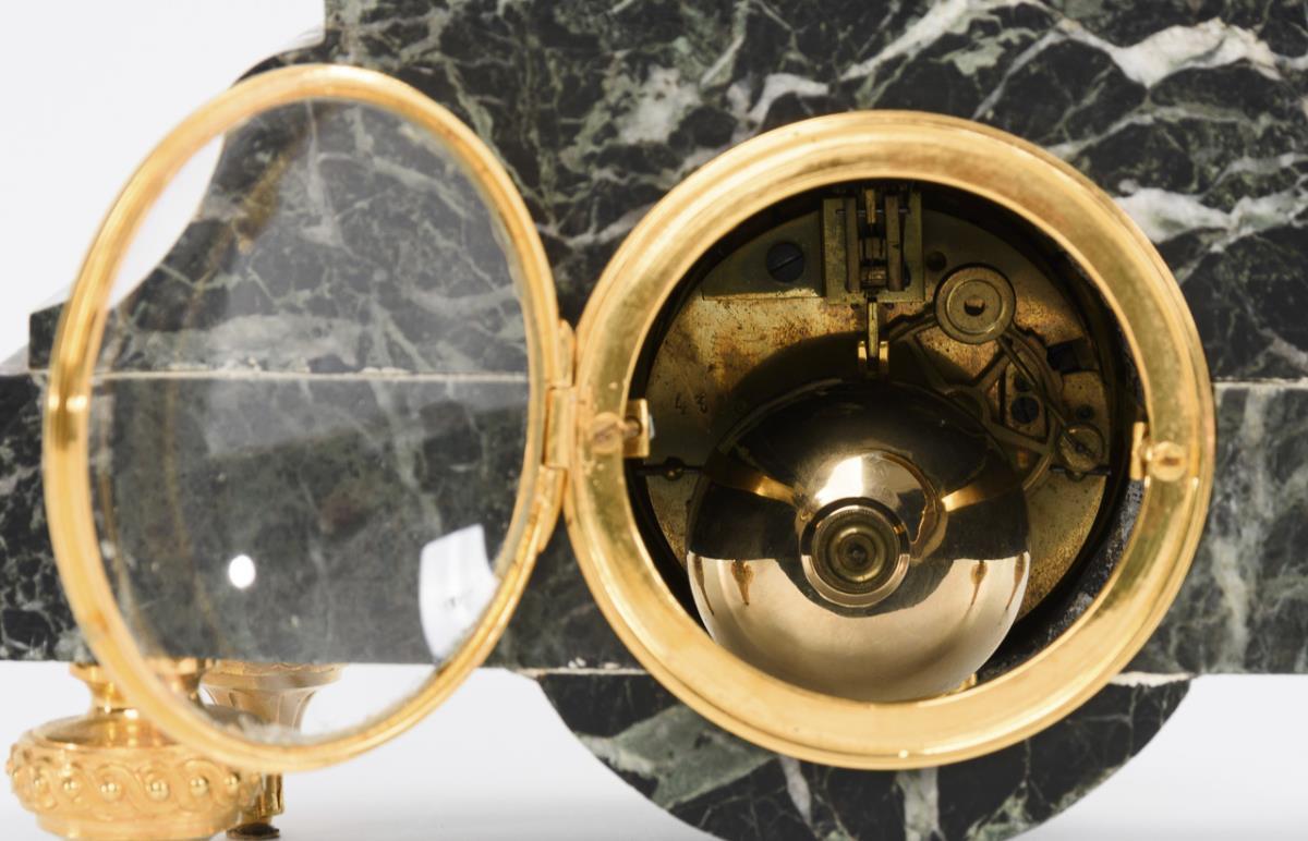 Black marble with green veining, bronze, brass re-set. Approx. 46.5 x 24.5 x 20 cm. 10.5 kg.