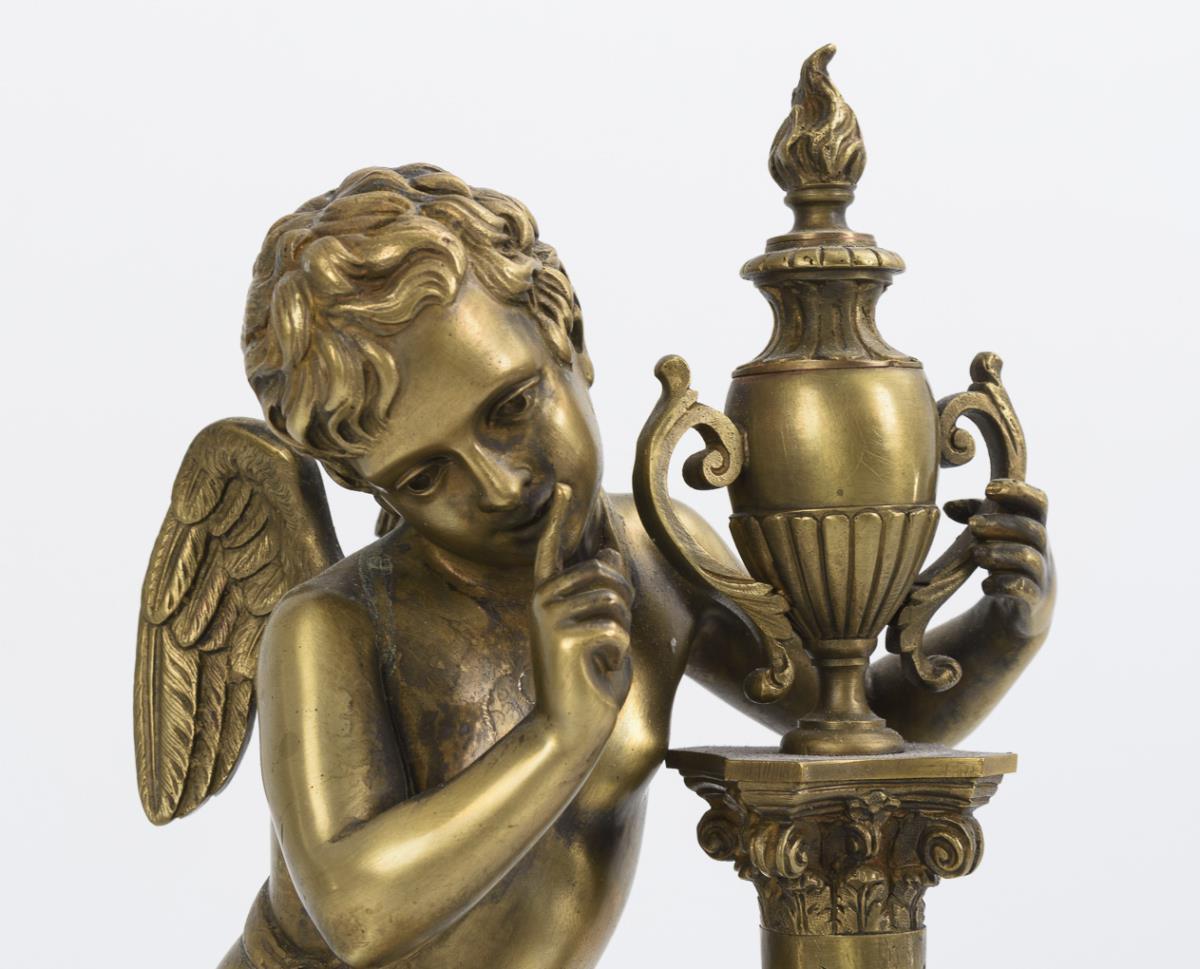 Pendule in historicizing style with crowning putto standing by a column with urn and torch. Use of old and new parts, minimal signs of age and use.