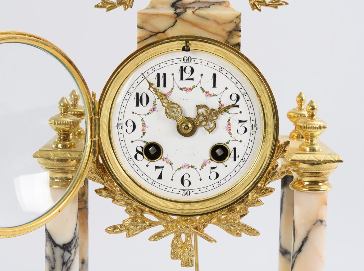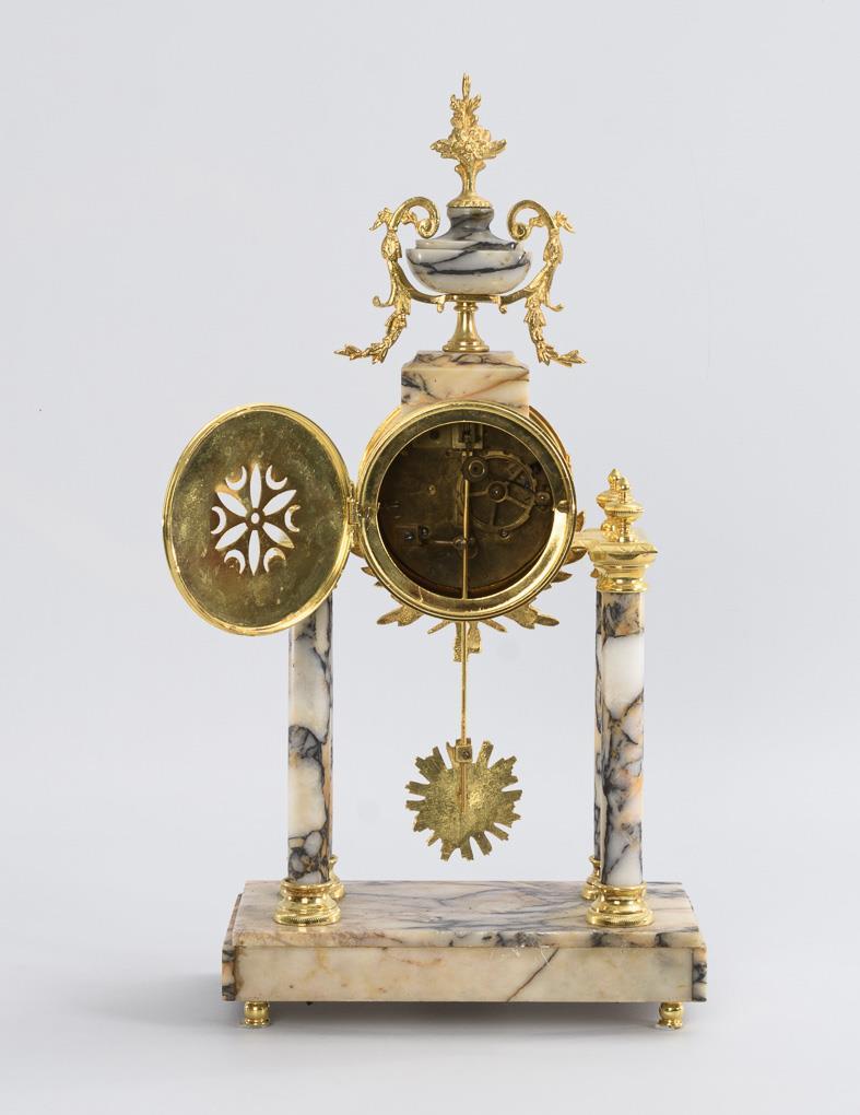 Elegant portal clock with 4 columns and a crowning amphora. Use of old and new parts, minimal signs of use, dial rubbed in the center.